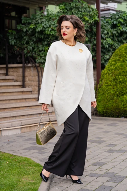 Пальто свободного покроя с лёгким заужением к низу и со спущенной линией плеча.Подкладка с синтепоном, что придает дополнительный комфорт в прохладную погоду. Спинка со средним швом.По переду имеются прорезные карманы с листочкой.Борта закруглённой формы.Застежка двубортная на пришивные кнопки.Верхняя пуговица авторской формы.