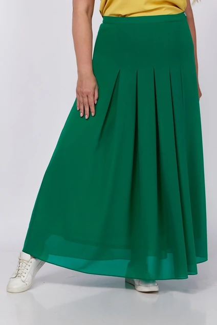 Комфортная, нарядная, длинная юбка-трапеция из шифона с обработанными бантовыми складками по талии. В боковой шов вставлена потайная молния. Юбка на поясе на петлю и пуговицу и частично на резинке. Лаконичный и элегантный фасон позволит носить его в повседневной жизни, а также как праздничный или вечерний наряд. Длина юбки (см): 102