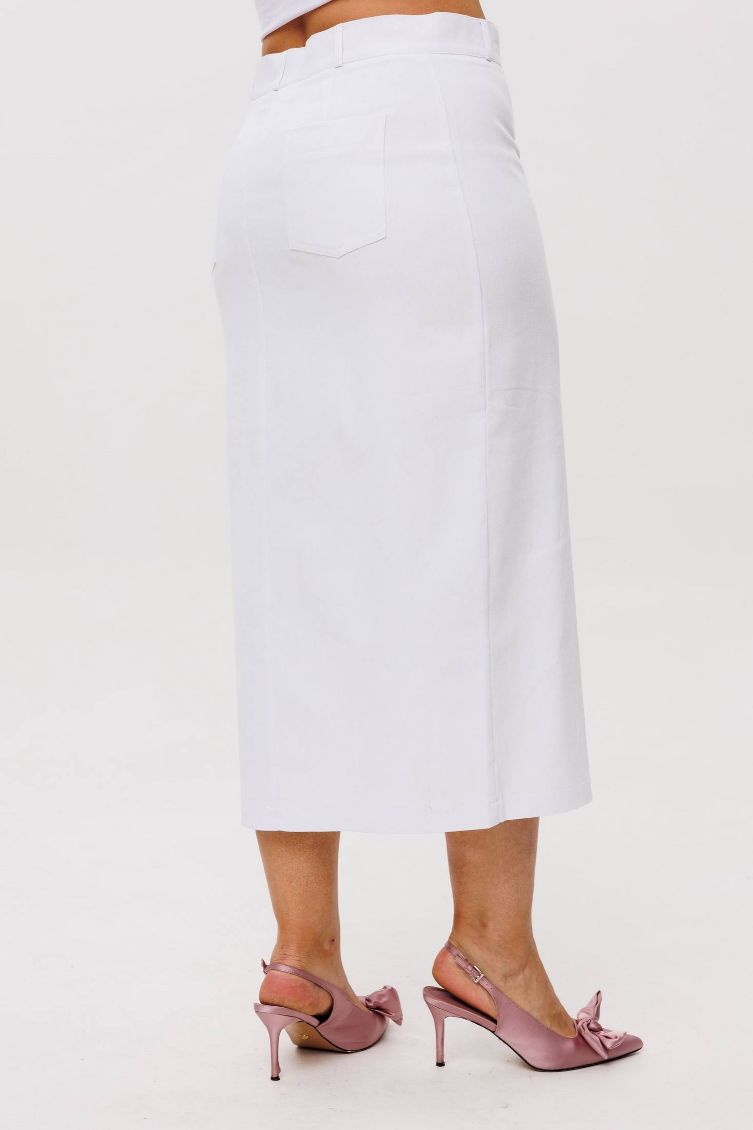Кнопки спереди позволяют регулировать длину выреза, добавляя образу уникальность и удобство. Два кармана сзади не только придают юбке стильный вид, но и обеспечивают функциональность.