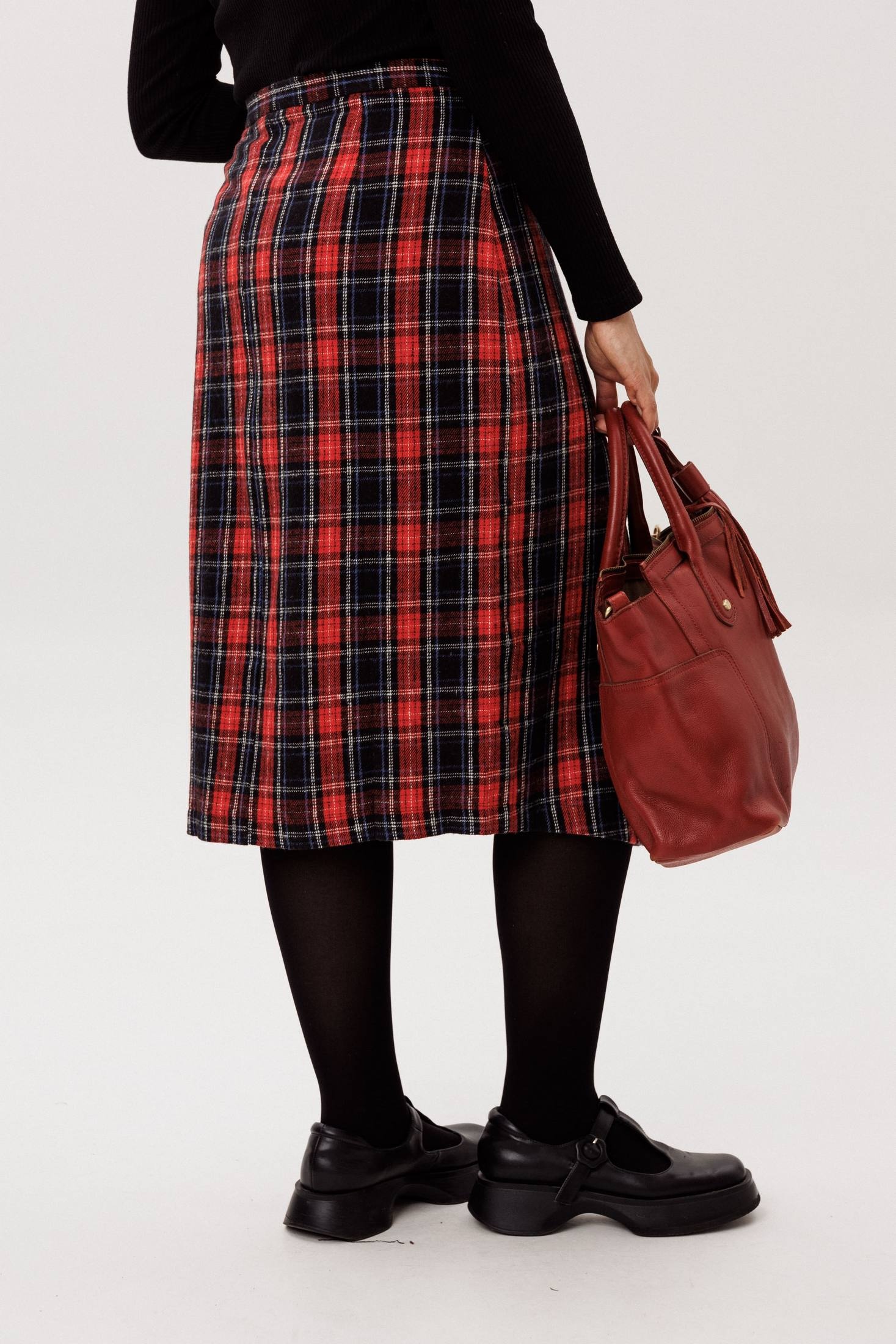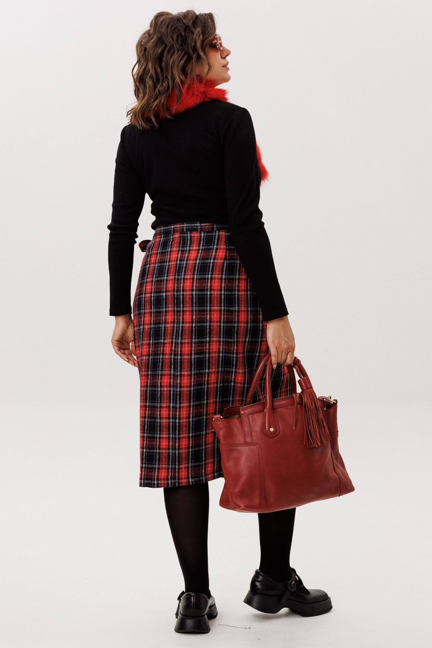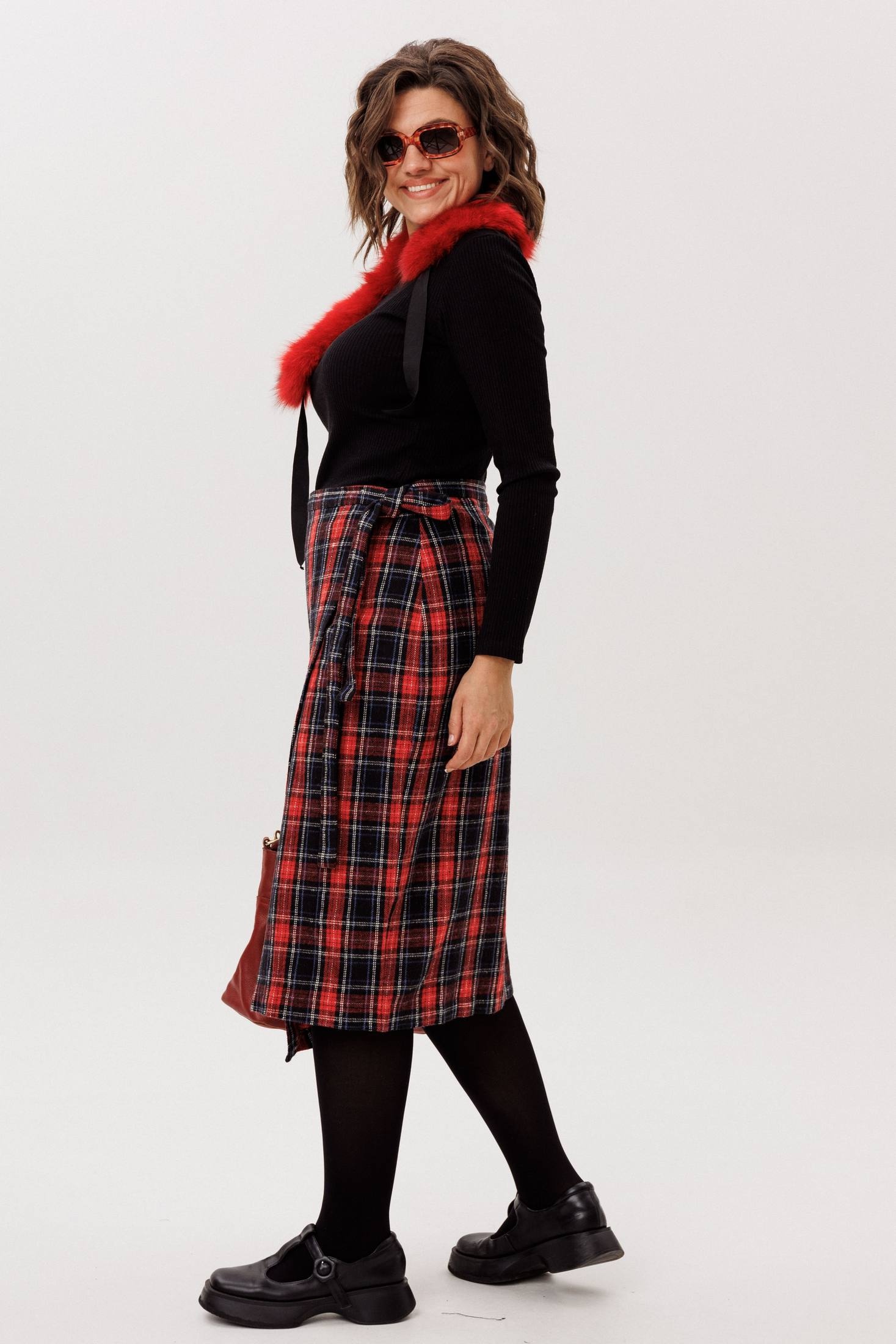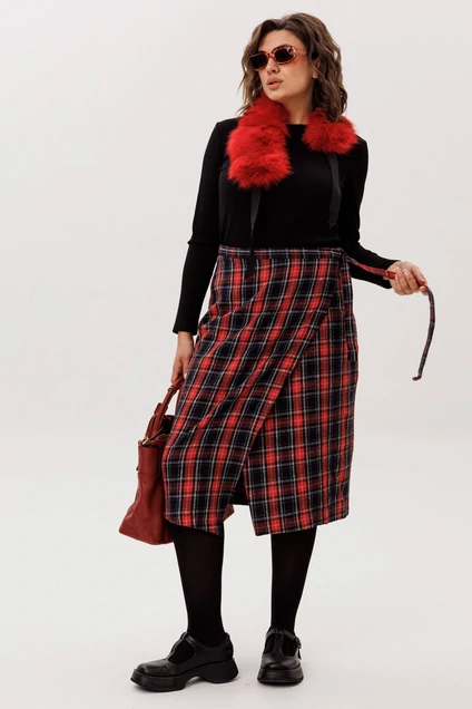 Теплая юбка на запах миди-длины — идеальный атрибут для прохладной погоды. Асимметричный край разбавляет строгость образа игривостью и придает ему смелости.