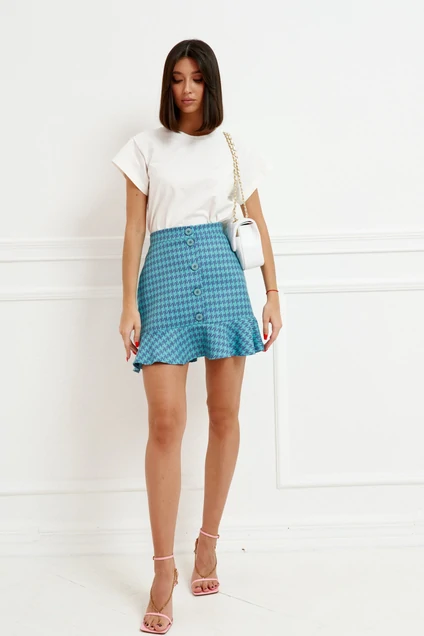 Юбка полуприлегающего силуэта выполнена из фактурной ткани.