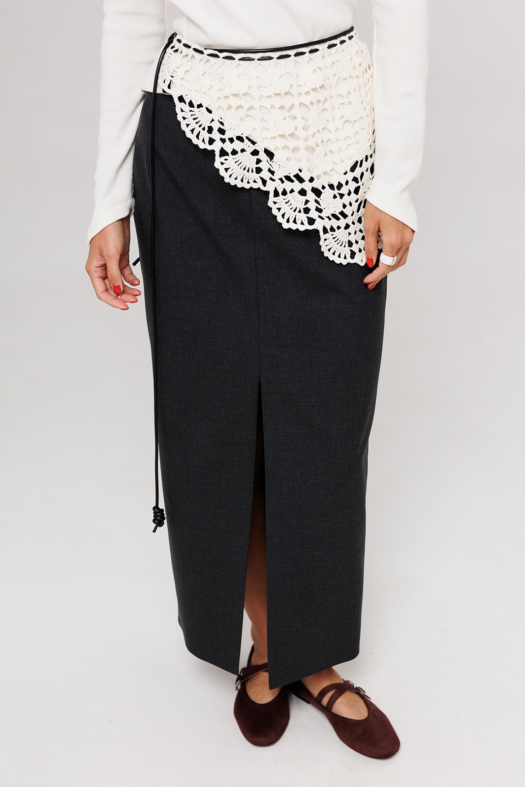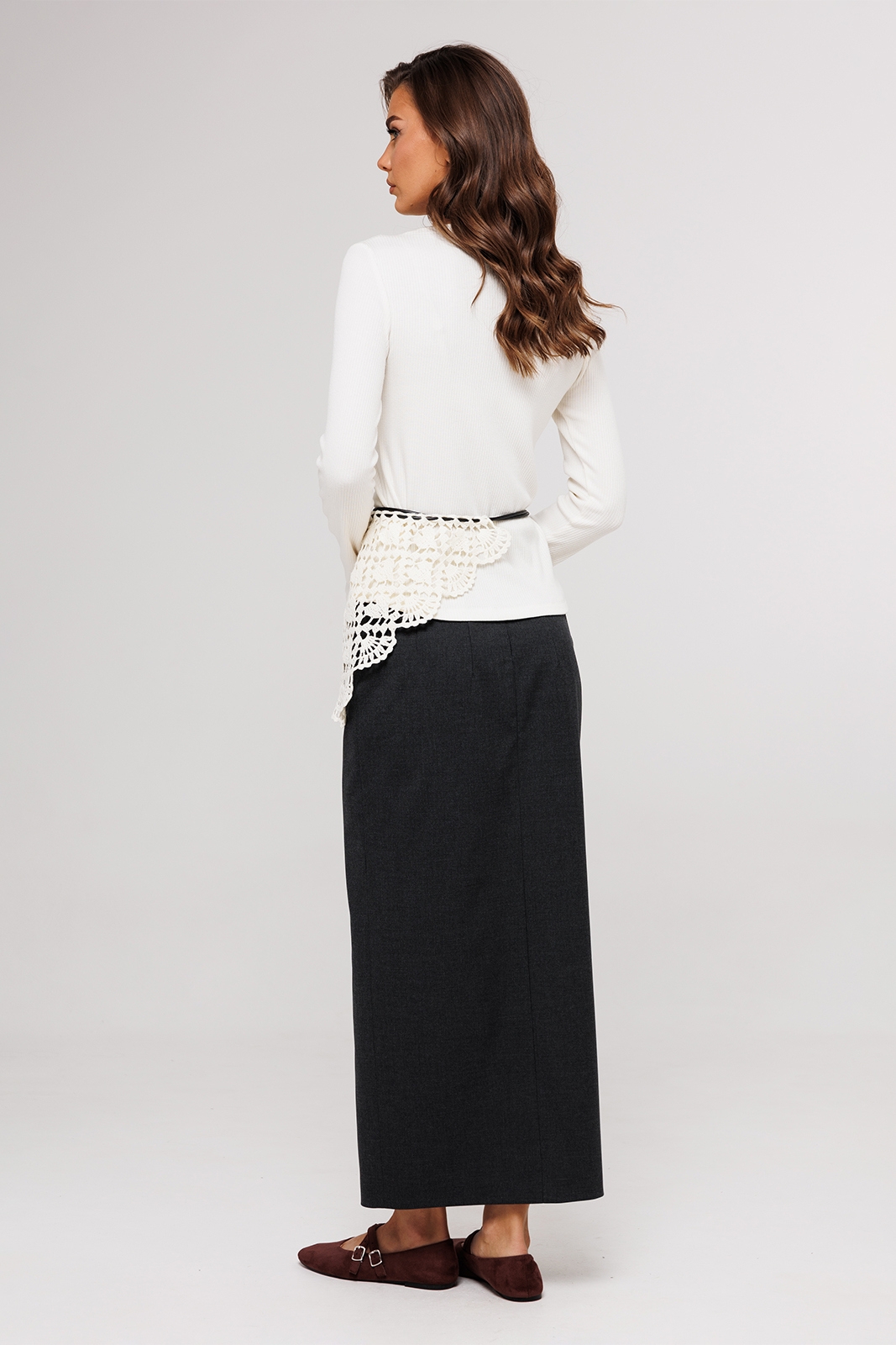 Юбка длинная прилегающего силуэта на притачном поясе. По переду вертикальные вытачки от пояса и центральным швом внизу заканчивающимся высоким разрезом. Спинка с 2-мя вертикальными вытачками от пояса, центральным швом и застежкой на потайную тесьму-молнию в центральном шве. Юбка на подкладке.