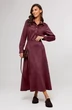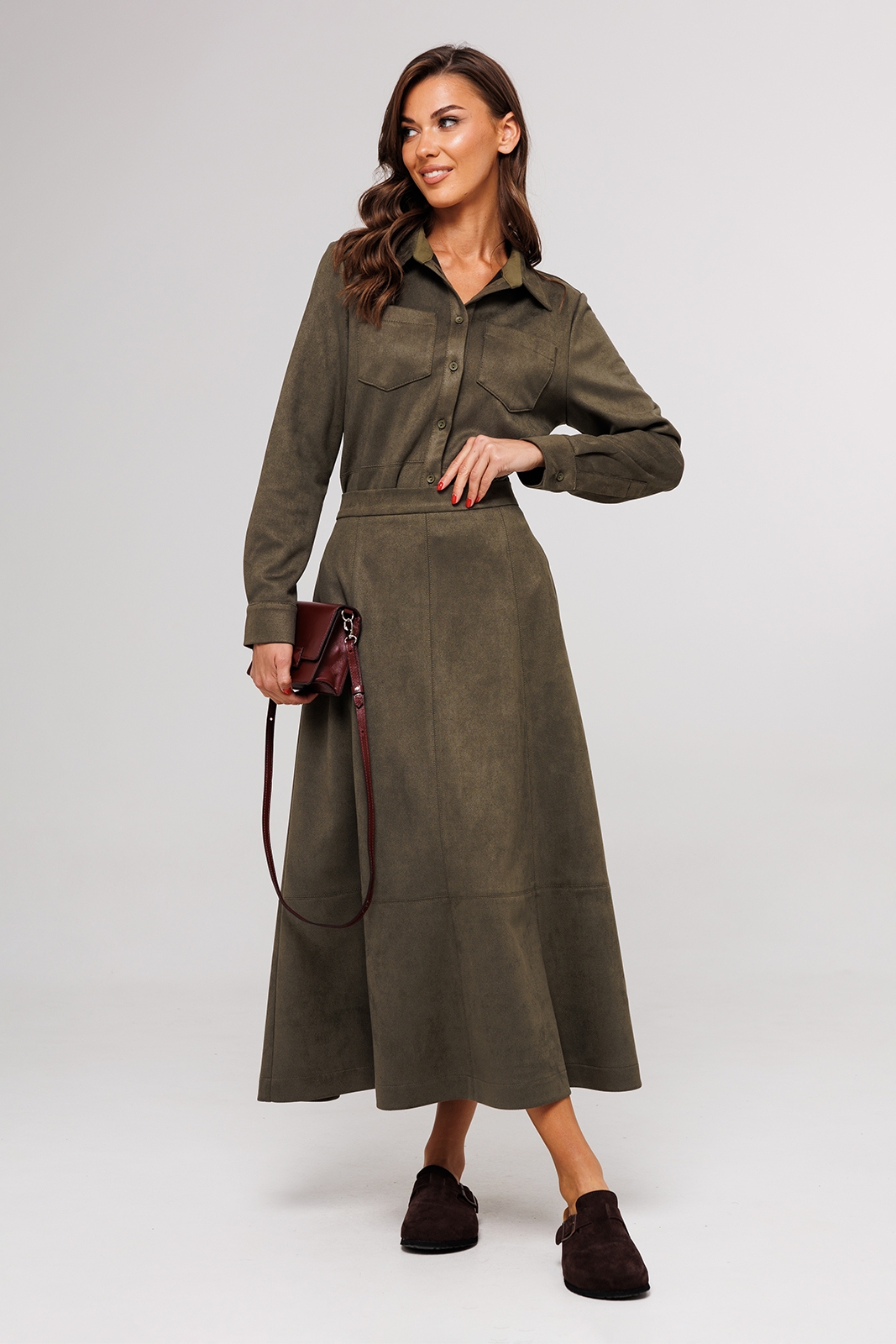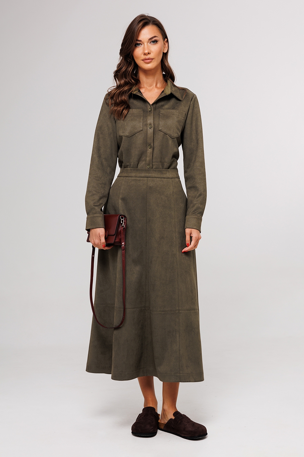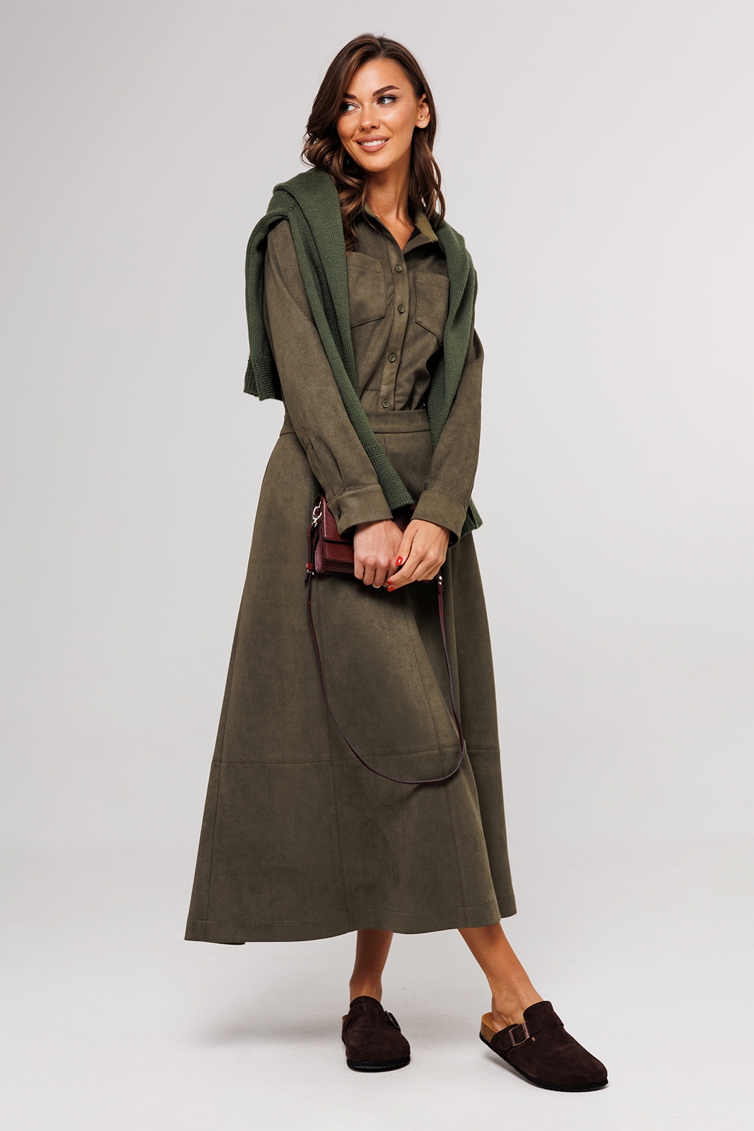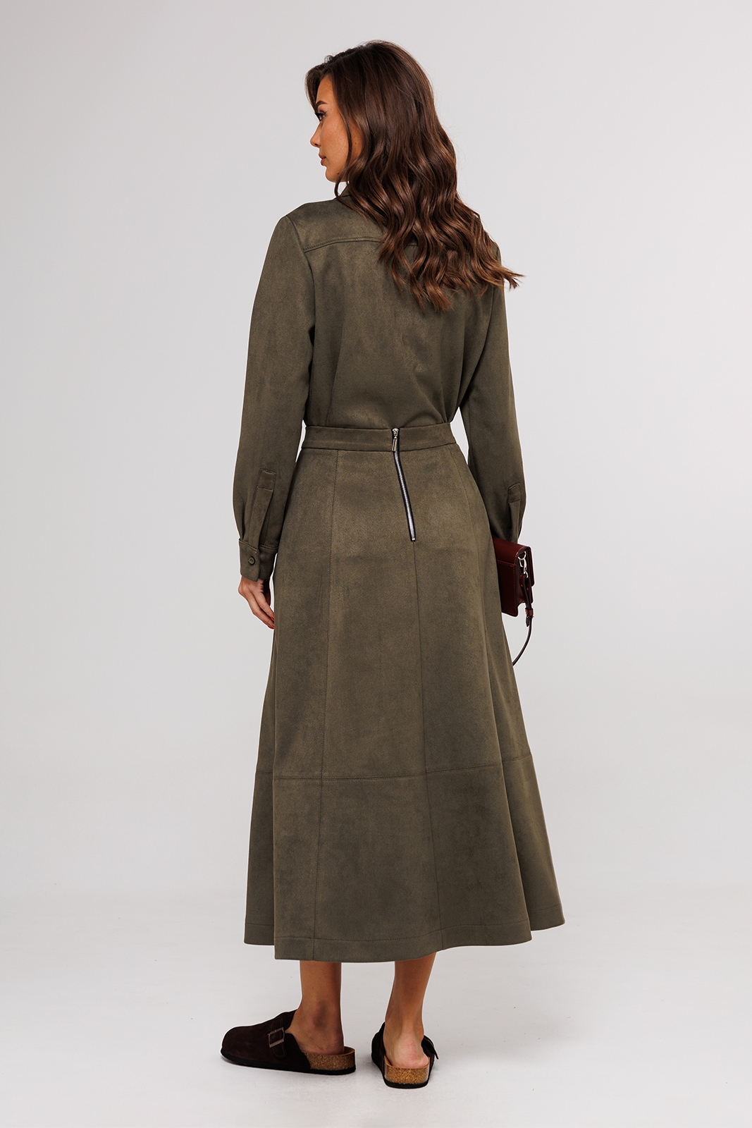 Юбка замшевая длинная А-силуэта на притачном поясе и карманами в боковых швах. Полочка и спинка с центральным швом, рельефами и горизонтальным подрезом. По спинке вверху в центральный шов вставлена металлическая молния. Юбка без подкладки.