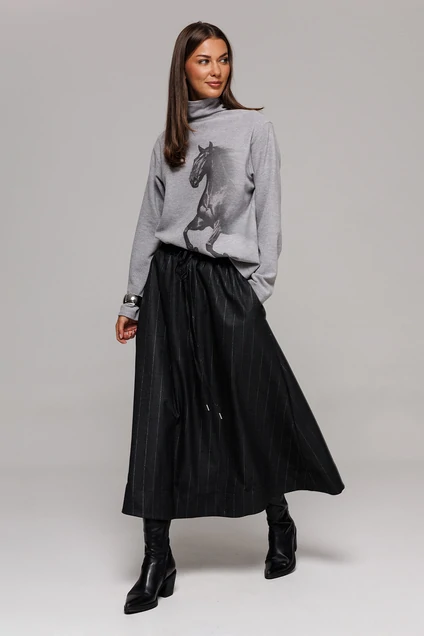 Элегантная миди-юбка А-силуэта выполнена из костюмной ткани с сияющим люрексом в узкую полоску. Этот дизайн дополнен удобным притачным поясом на резинке, декорированным отстрочкой и шнурком с наконечниками для регулировки по фигуре. Модель оснащена вместительными карманами в боковых швах, добавляя практичности. Особенный акцент – нашивка "BUTER" на передней нижней части юбки. Создана без подкладки, что делает её идеальной как для повседневного, так и для вечернего образа.