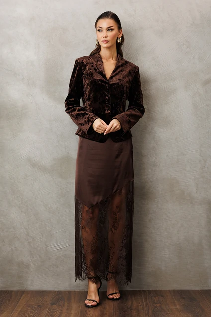 Юбка прямого силуэта из атласа и кружева. Юбка на обтачке. По переднему и заднему полотнищам юбки - вытачки. Юбка с застежкой в боковом шве на потайную тесьму-молнию. Верхняя часть юбки из атласа с асимметричный краем, нижняя часть юбки из кружева с ажурным низом. Юбка без подкладки.