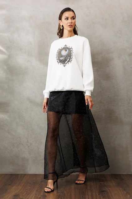 Элегантная черная юбка A-силуэта - это исключительный выбор для современного гардероба. Юбка выполнена из двух слоев: нижний короткий слой изготовлен из костюмной ткани, создавая твердую основу, в то время как верхний слой из тонкой черной органзы украшен мерцающими стразами, придающими изделию торжественный вид. Длинная юбка обеспечивает изящное падение ткани, а потайная молния в боковом шве обеспечивает идеальную посадку. Верх юбки на аккуратной обтачке подчеркивает продуманный дизайн. Эта юбка станет прекрасным дополнением для создания вечернего образа.