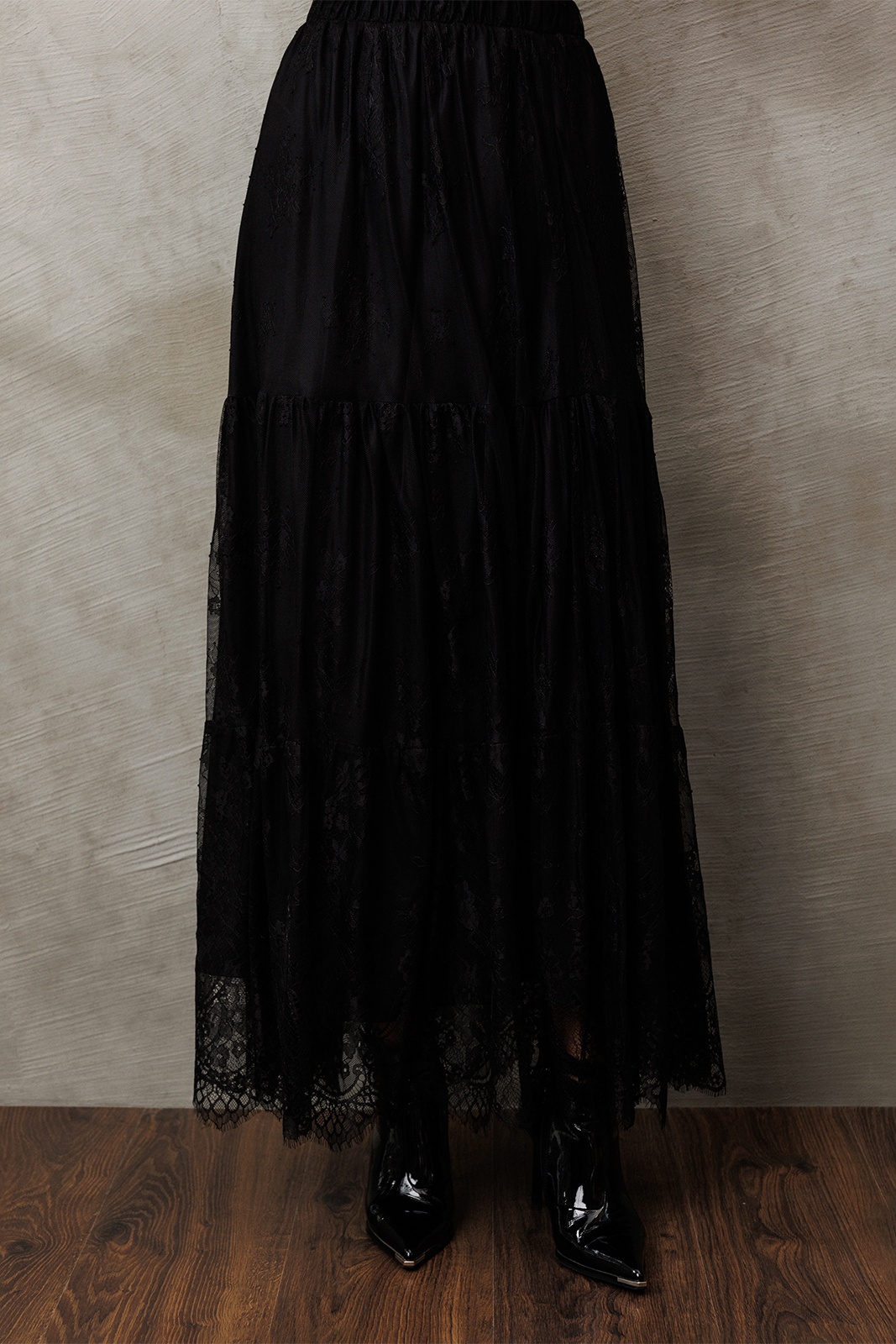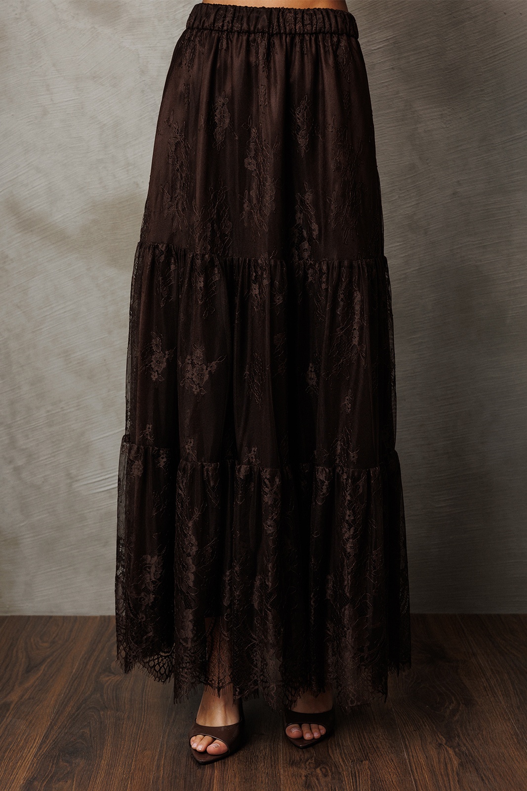 Длинная кружевная юбка коричневого цвета представляет собой настоящее воплощение элегантности и женственности. Дизайн модели включает притачной пояс из кружева с вставленной в него резинкой, что обеспечивает удобство при носке. Юбка украшена двумя слегка присборенными воланами, добавляющими изысканности и объёмности. Модель выполнена на подкладке, что делает её не прозрачной и удобной в носке. Изящество кружева и тщательная обработка деталей делают эту юбку идеальным выбором для создания романтических и стильных образов.