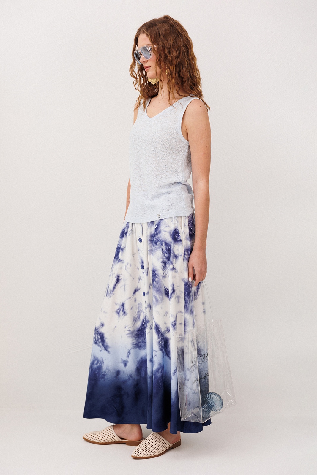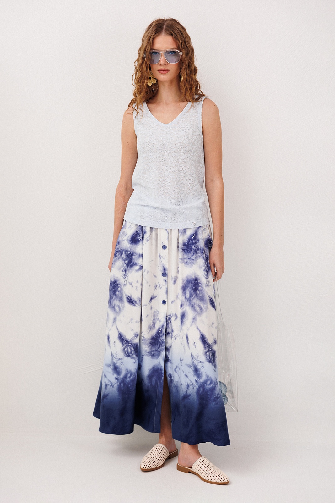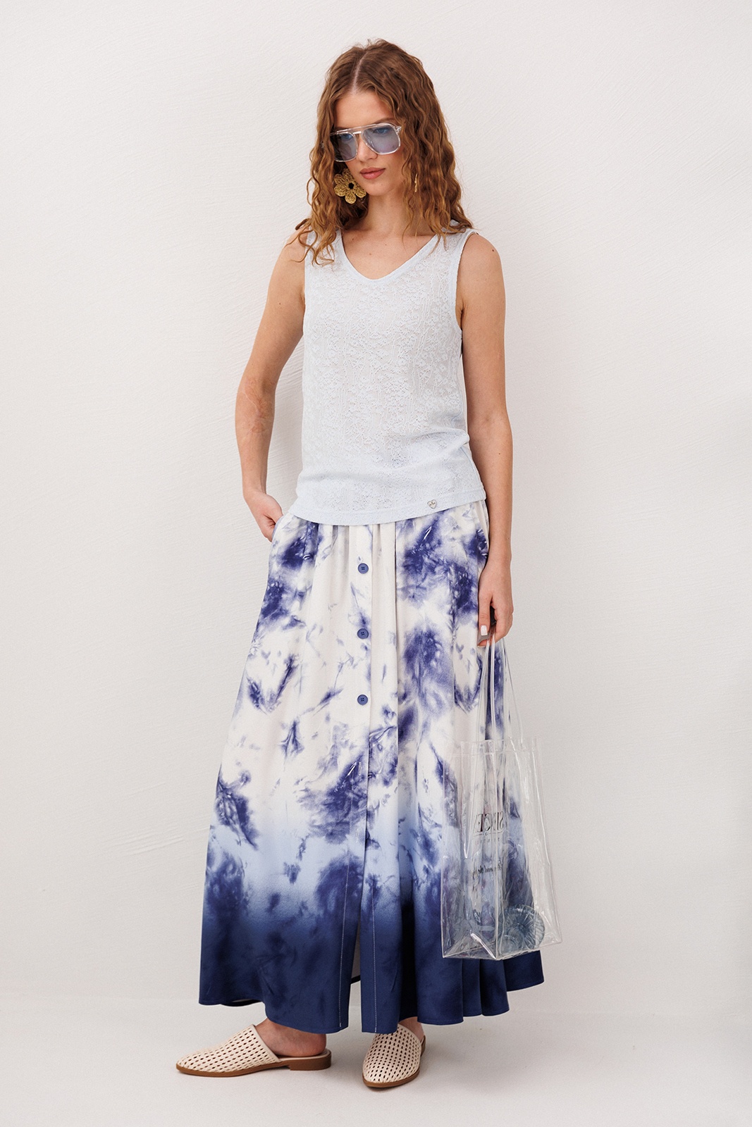 Юбка 3342 синий принт BUTER —это стильный выбор для повседневного гардероба. Коллекция бренда BUTER предлагает юбку А-образного силуэта, выполненную из легкой и дышащей вискозы, идеально подходящей для весенне-летнего сезона. Центральная застежка на пуговицах и карманы в боковых швах добавляют функциональности и комфорта. Элегантный синий принт придает изделию свежесть и отличает его от других моделей. Пояс на резинке обеспечивает удобную посадку и дополнительно подчеркивает вашу талию.