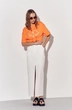 Юбка женская, джинсовая, длинная, с застежкой на тесьму молнию с гульфиком и откоском в верхней части среднего шва переднего полотнища юбки, с притачным поясом со шлевками. Пояс застегивается на прорезную петлю и болт. Переднее полотнище с подрезом, в который втачана нижняя часть юбки; с разрезом, с боковыми фигурными карманами. В правом кармане настрочен маленький накладной карман. По бокам карманов – хольнитены. Спинка со средним швом и талиевыми вытачками.