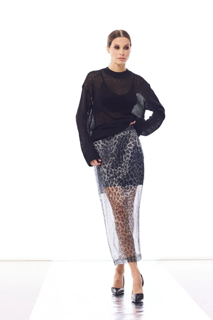 Юбка прямого силуэта выполнена из принтованной органзы . Юбка на трикотажной подкладке , по спинке разрез . Верх юбки обработан притачным поясом , застежка на потайную молнию .