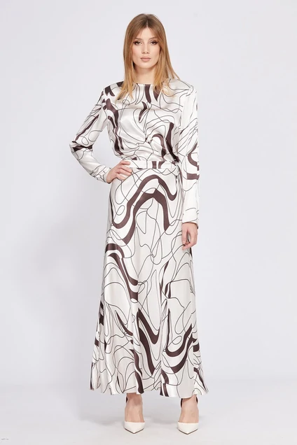 Юбка выполнена из атласа с абстрактным принтом. Юбка расширенная к низу, на притачном поясе, длиной миди. Переднее и заднее полотнища цельные и выкроены по косой. Застежка в левом боковом шве на потайную молнию и пуговицу. Юбка на отлетной по низу подкладке.