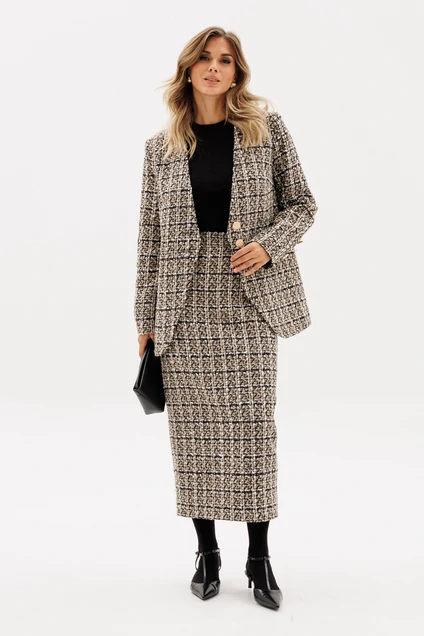 Юбка выполнена из твида. Юбка заужена к низу, длиной миди. Юбка на притачном поясе. Сзади в среднем шве разрез и застежка на потайную молнию и пуговицу. Юбка на отлетной по низу подкладке.