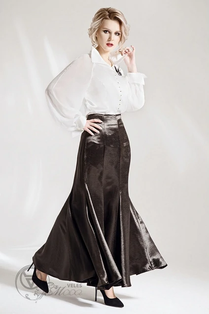 Юбка женская на подкладке с завышенной талией, силуэта " годе". Юбка прилегающая не бедрах и расклешенная к низу, удлиненная- по щиколотку, выполнена из ткани- мраморный атлас. Застежка - потайная молния. Длина изделия 98 см. Состав основной ткани ПЭ-65,1; Вискоза 30,3; Спандекс 4,6: Состав подкладки: Пэ-100