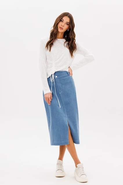 Юбка-карандаш из денима, длины миди интересного перевернутого кроя. Все швы смещенные от центра, как бы закручивают изделие, придавая ему нехарактерный образ. Модель на притачном поясе со шлевками, боковыми фигурными карманами, задними накладными карманами. По центру переда-высокий разрез.