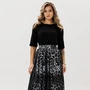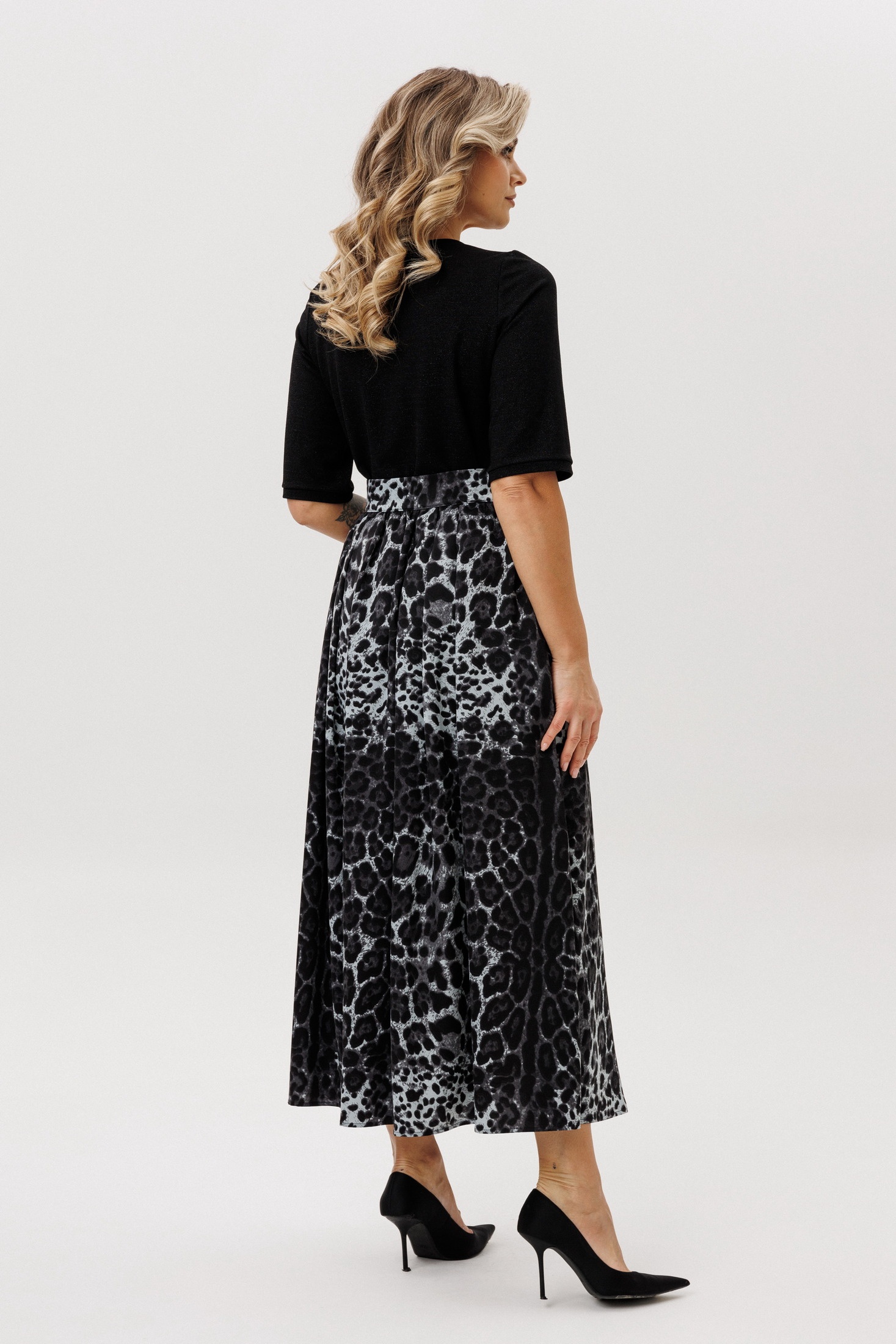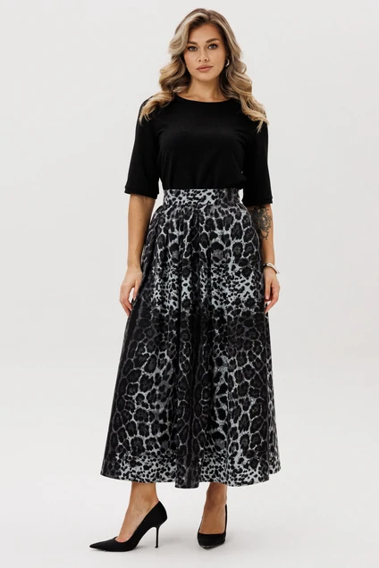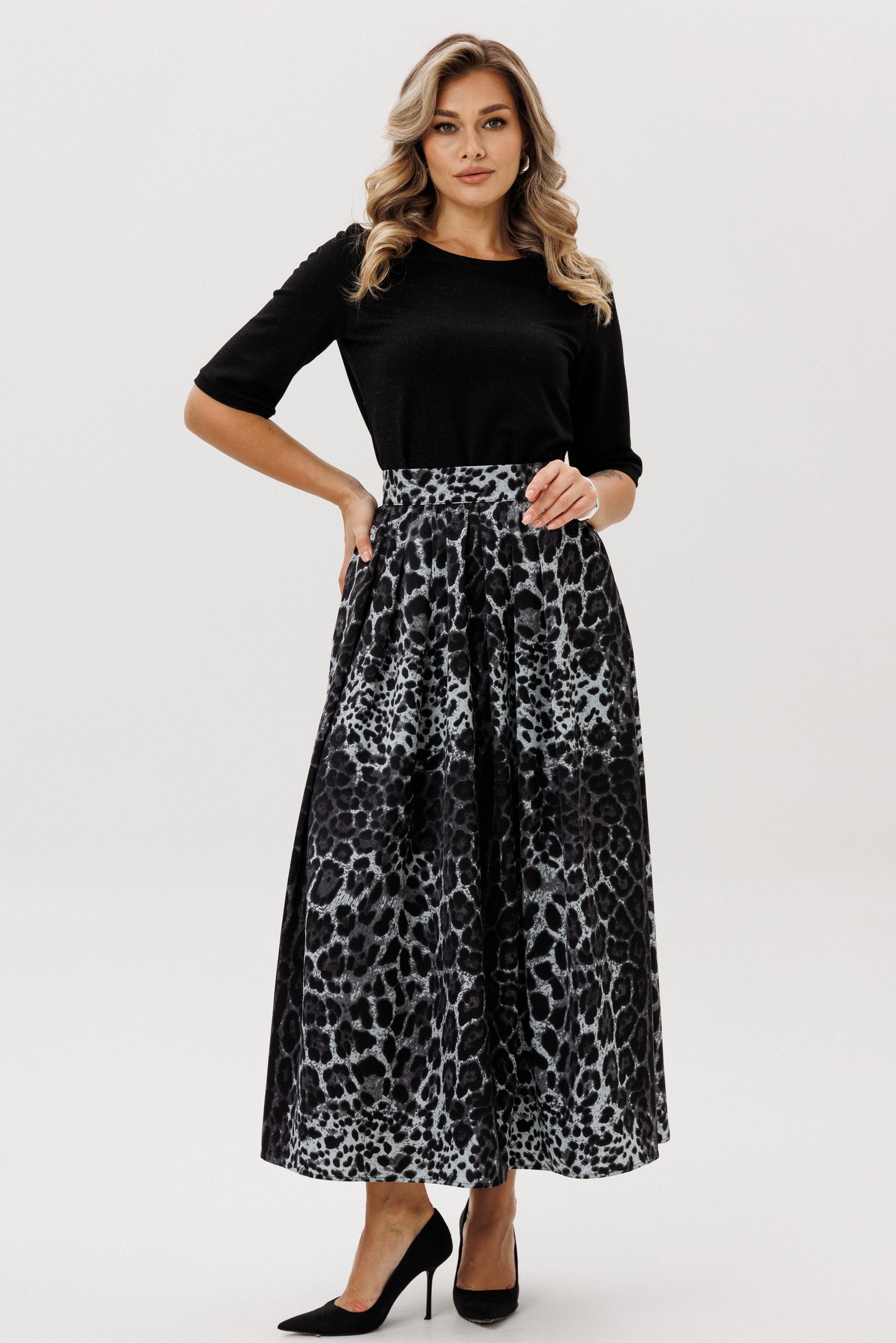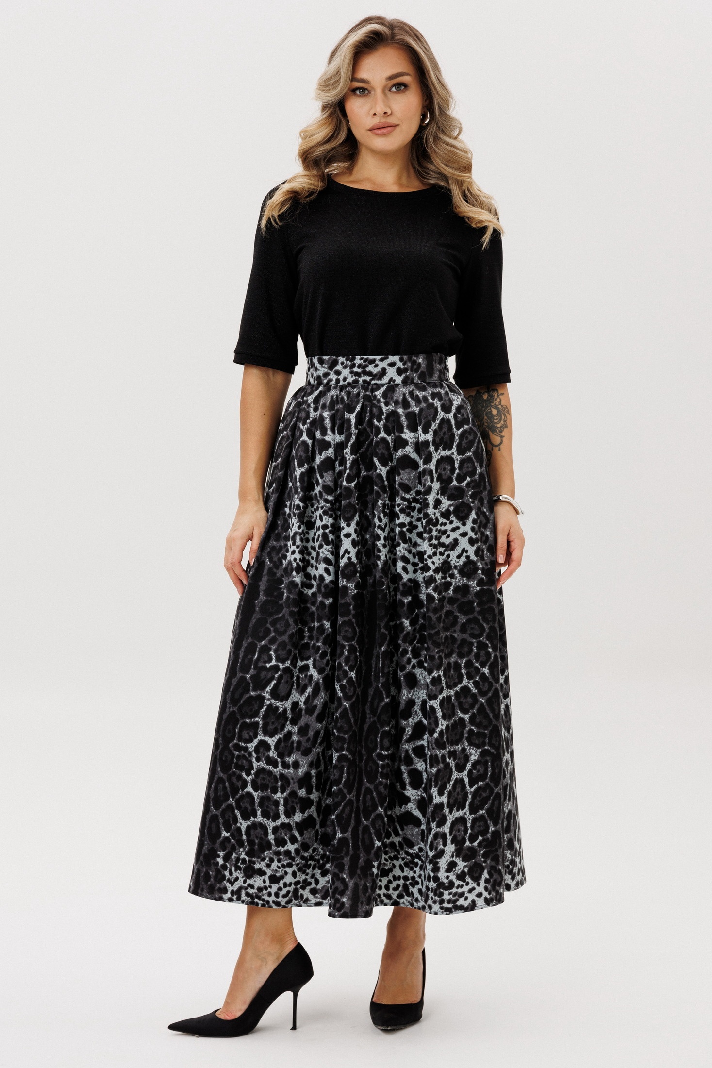 Изысканная юбка макси из плательной ткани, выполненная в свободном силуэте, станет идеальным дополнением к вашему гардеробу. Этот модель оформлена стильным черно-белым принтом, имитирующим животный узор, что добавляет изделию оригинальности и современного шика. Юбка не имеет подклада, что обеспечивает дополнительный комфорт при носке. Удобные карманы по бокам делают модель практичной и функциональной.