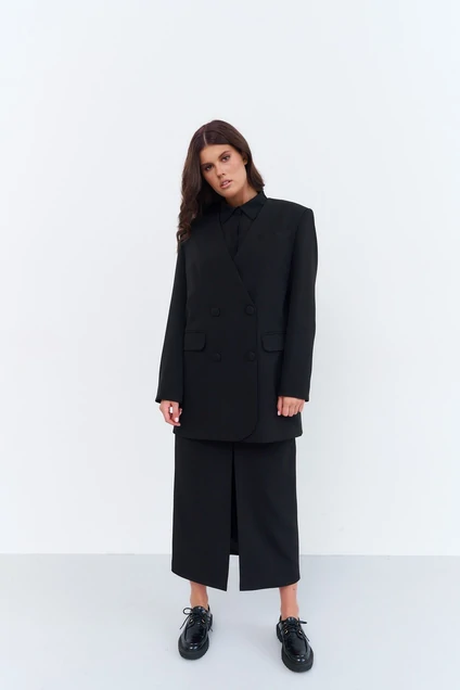 Юбка прямого силуэта в длине миди. Характеристики: выполнена из костюмной ткани в черном цвете, по центру переда разрез, юбка на подкладке, застежка-молния по заднему полотнищу юбки, верх юбки обработан поясом-обтачкой. Длина юбки 93,5 см.