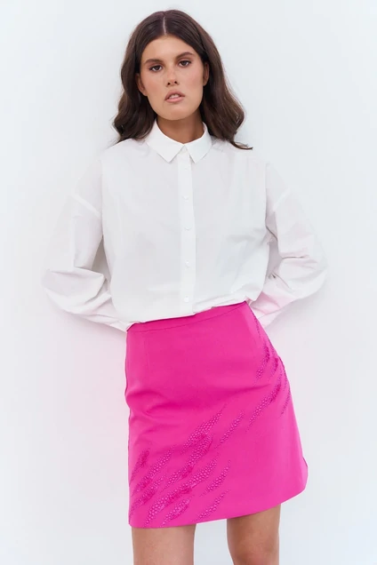 Юбка А-силуэта с вышивкой по переду. Характеристики: выполнена из плательной ткани в цвете розовой фуксии, юбка на подкладке, застежка-молния по заднему полотнищу юбки, верх юбки обработан поясом-обтачкой. Длина юбки 47 см.