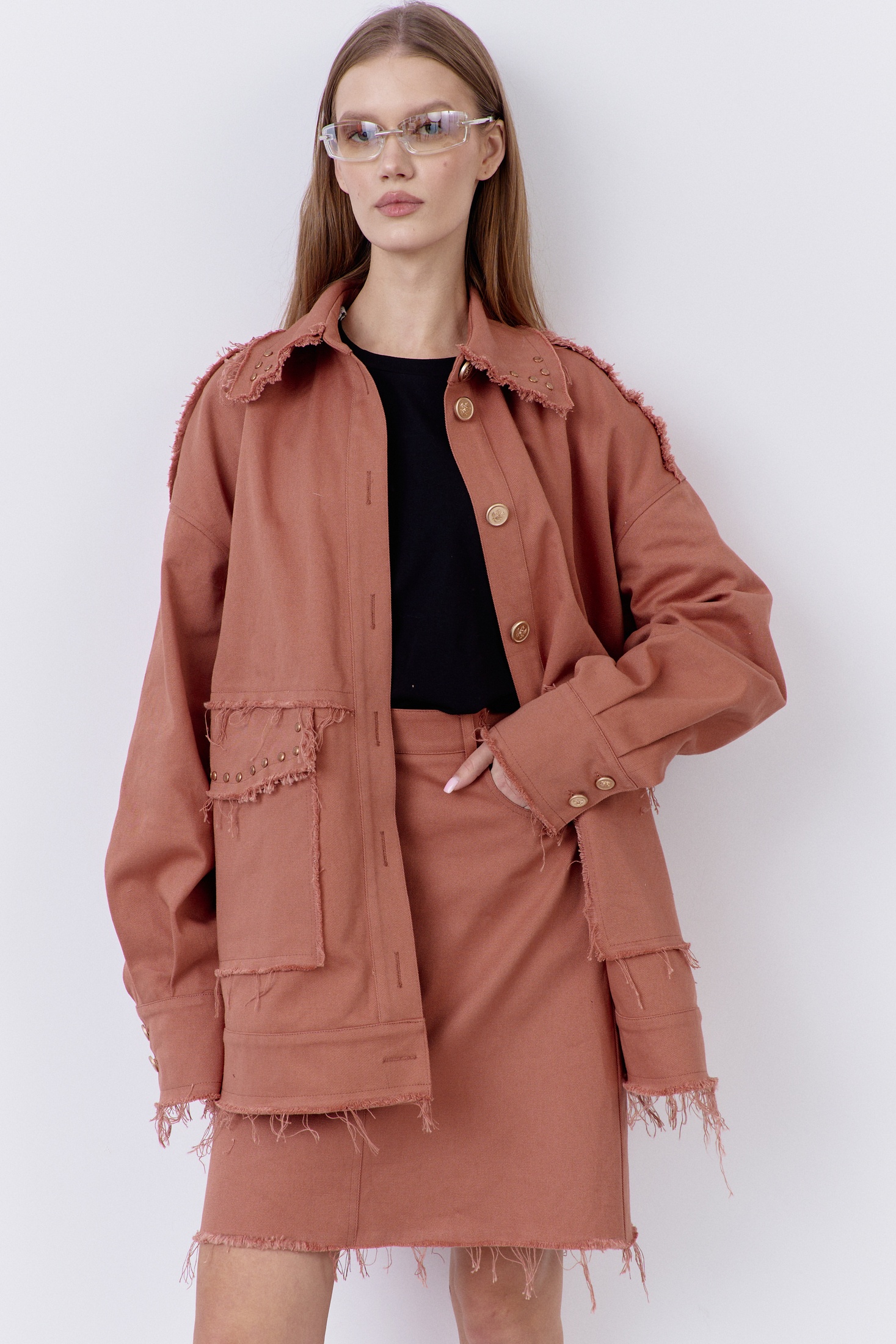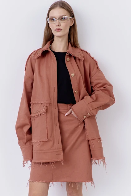 Юбка джинсовая в цвете розовый кирпич с карманами по переду. Верх юбки обработан поясом. По спинке отрезная кокетка и накладные карманы, по которым установлены кнопки.