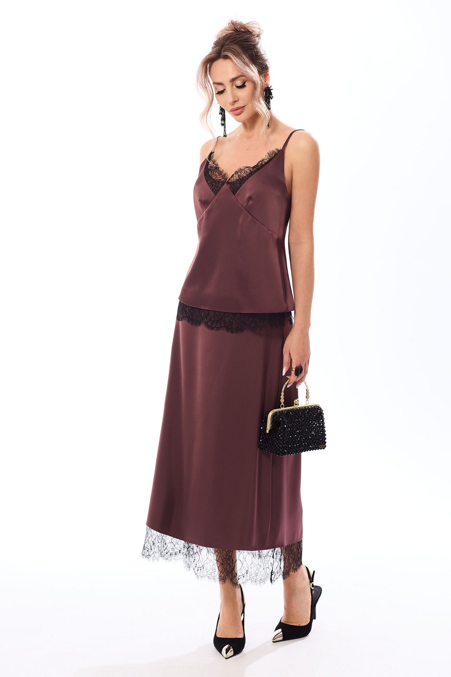 Юбка без пояса , застежкой на потайную молнию в левом боковом шве. Переднее полотнище цельное. Заднее полотнище с талиевыми вытачками. Верхний край заднего полотнища присборен на резинку. Низ юбки декорирован кружевом. Силуэт: прямой. Цветовая гамма для верха, подкладки, фурнитуры, отделки: юбка из ткани в одной цветовой гамме. Отделочные строчки в тон основной ткани. Тип ткани: текстильный