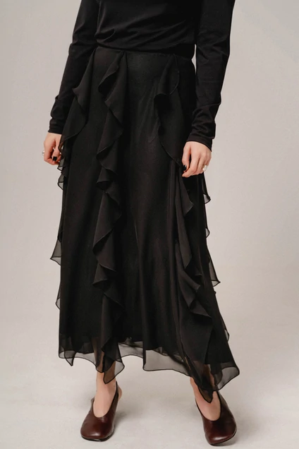 Юбка на подкладке трапециевидного силуэта типа "гаде" с расширением к низу 8 -и клиньев( вставлено какалье) из ткани шифон.На притачном поясе с застежкой молнией и пуговица. Миди.