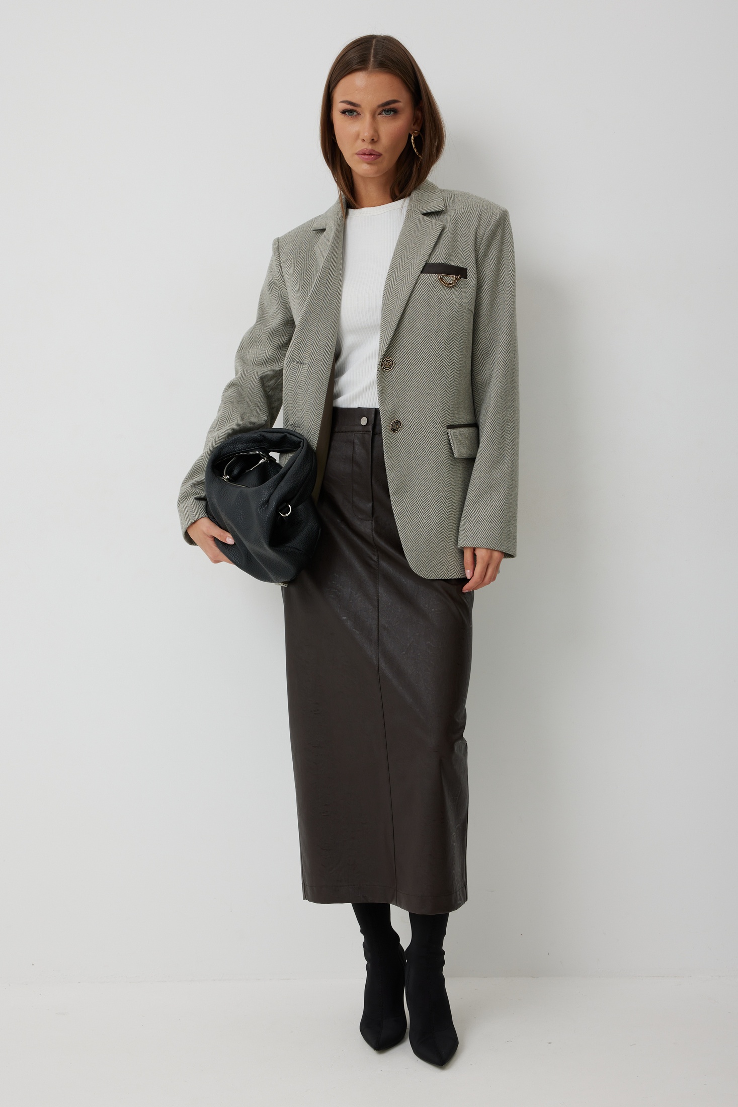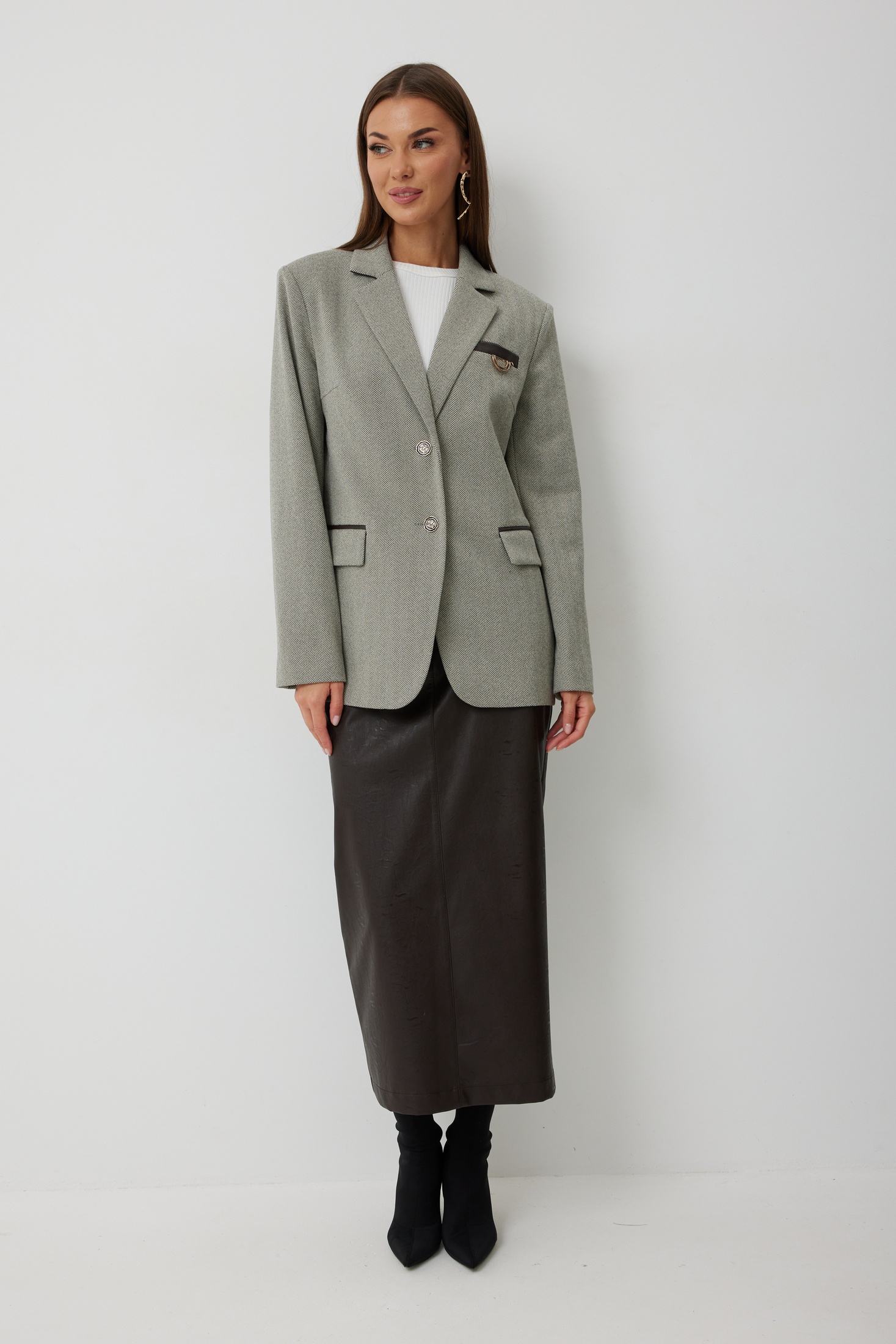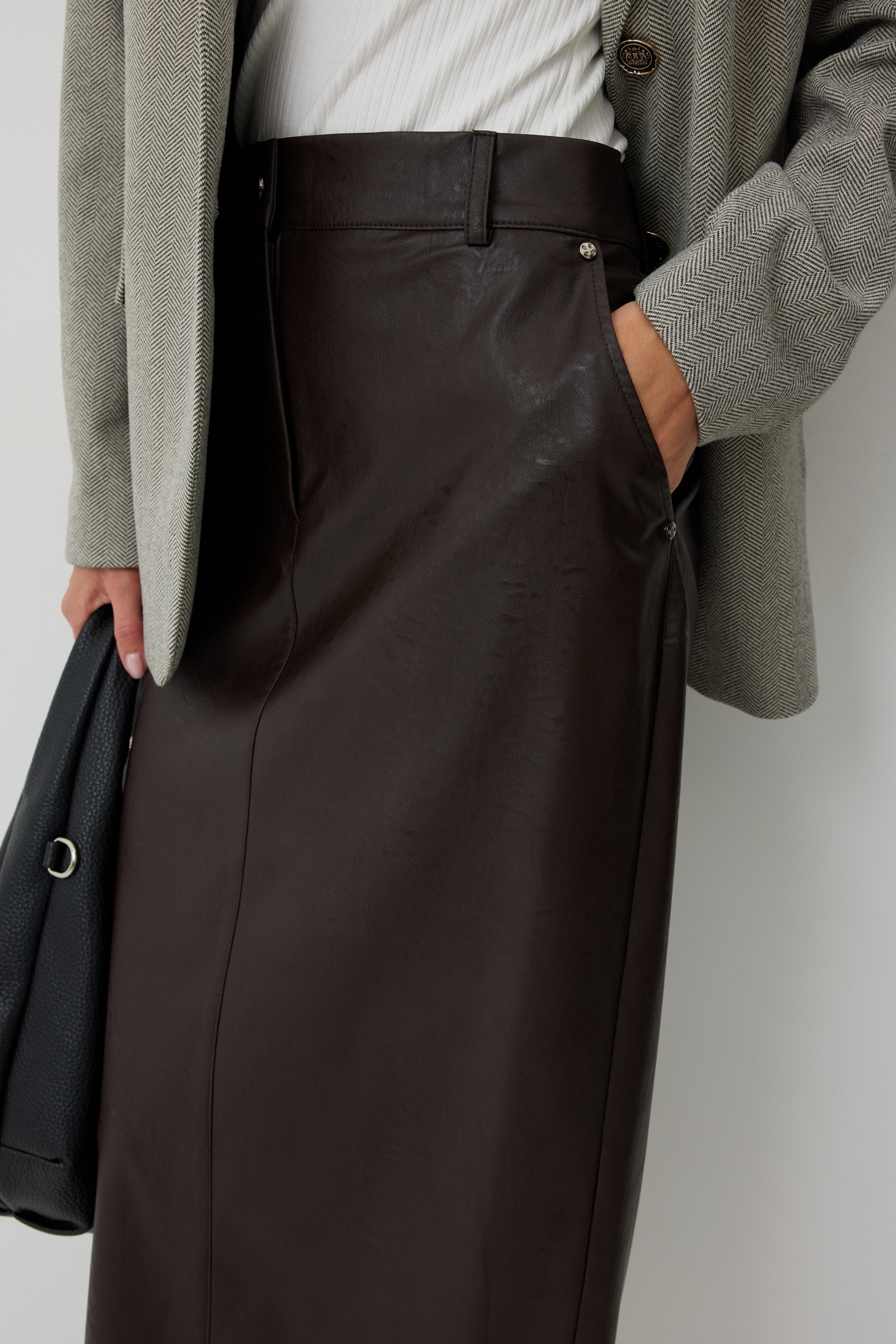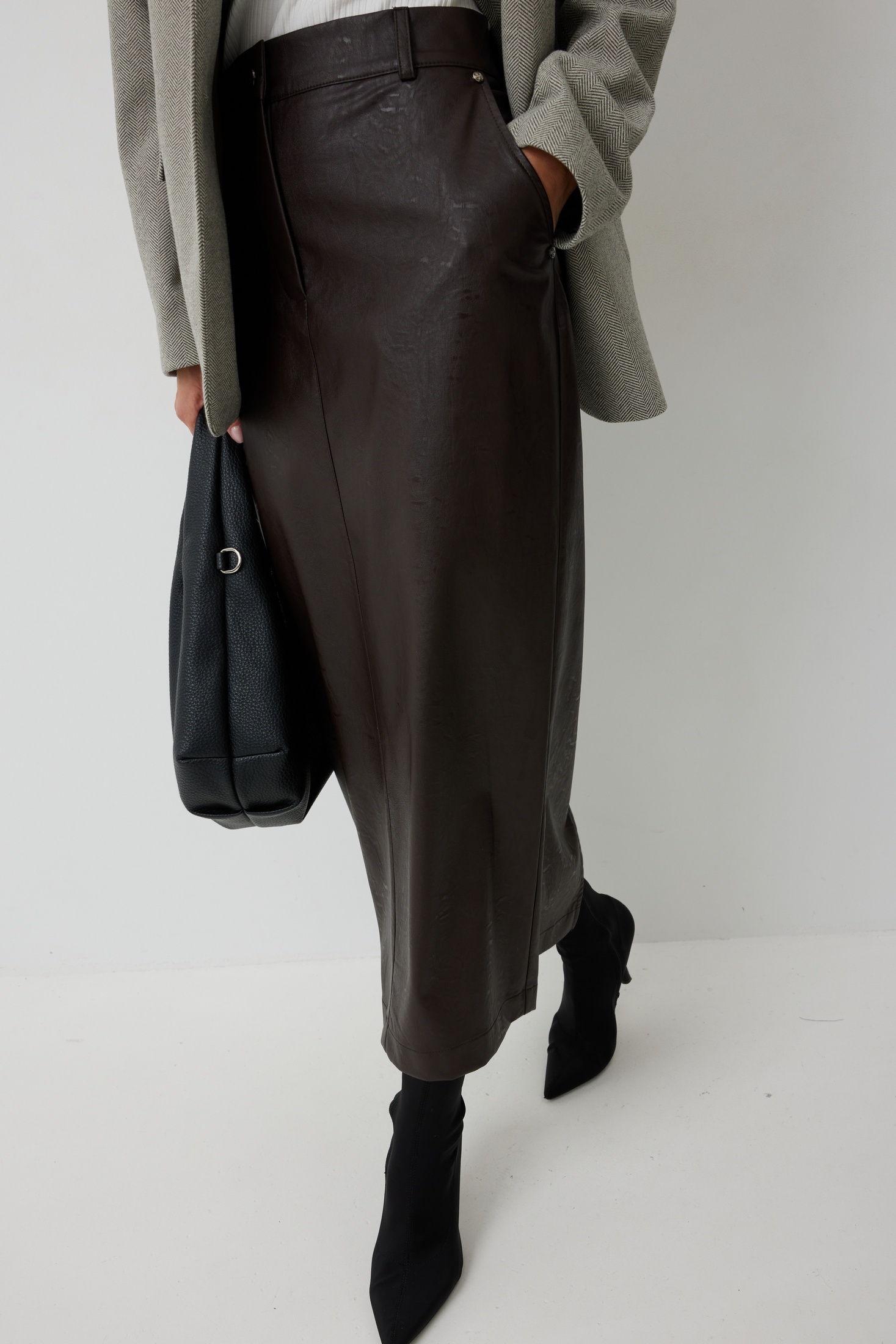 Юбка-карандаш женская из искусственной кожи. Длина юбки до середины икры. По переду в юбке обработаны карманы с отрезным бочком, по концам кармана установлены хольнитены. Перед юбки с центральным швом, в котором обработан гульфик с застежкой – молнией. Спинка юбки со средним швом в котором располагается разрез. Верх спинки юбки с отрезной фигурной кокеткой и вытачками. Верхний срез юбки обработан отрезным поясом, с резинкой по спинке и шлевками. Пояс застегивается на кнопку.