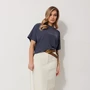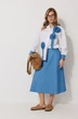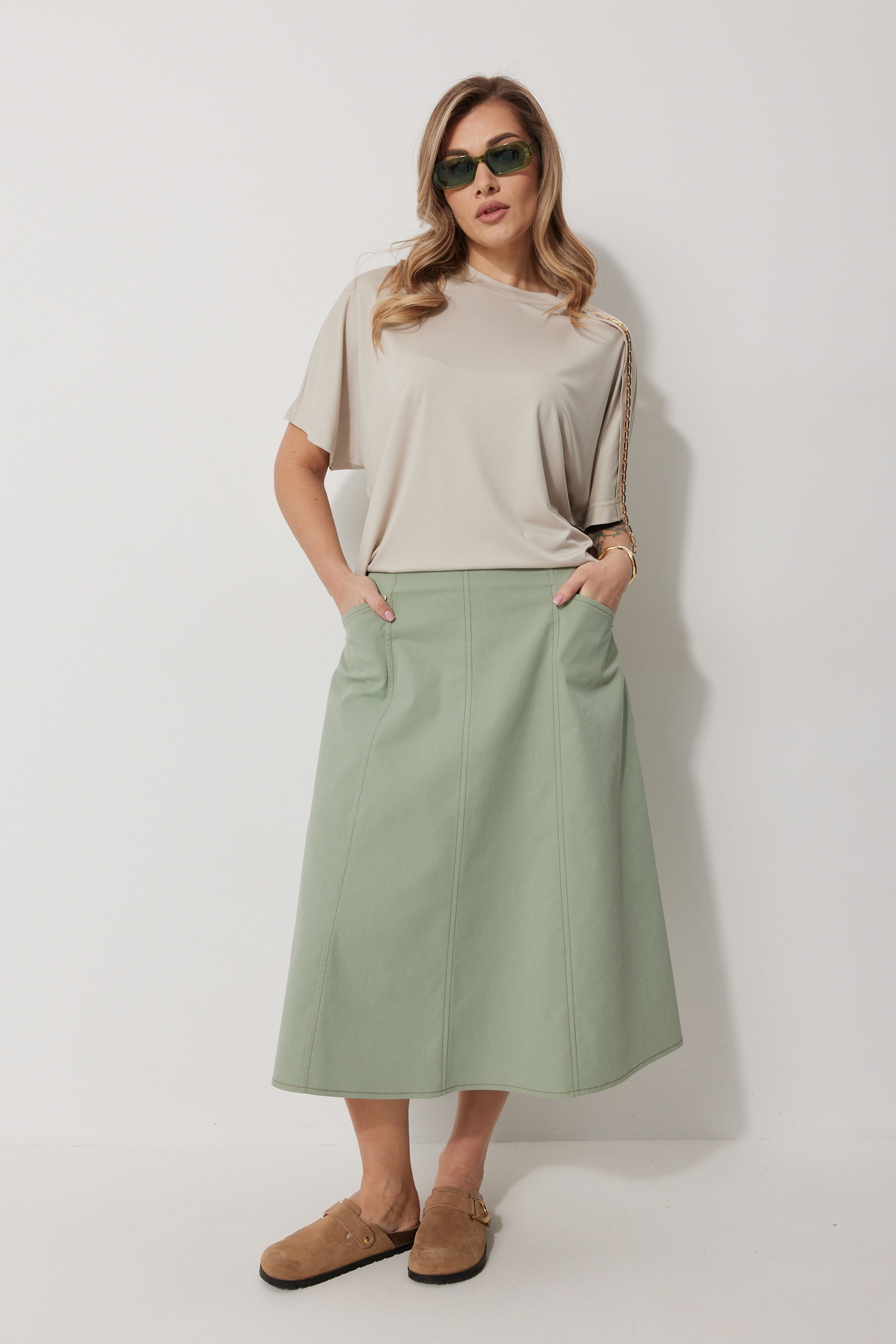 Юбка женская А – силуэта длиной до середины икры. Перед юбки состоит из 4 клиньев. Вверху передней части юбки располагается карман с отрезным бочком с хольнитенами по концам крмана. Спинка юбки состоит из 4 клиньев. Швы всех клиньев отстрочены контрастной отделочной строчкой По среднему шву юбки находится застежка – молния. Верхний срез юбки обработан обтачкой. Длина по боковому шву 80 см.