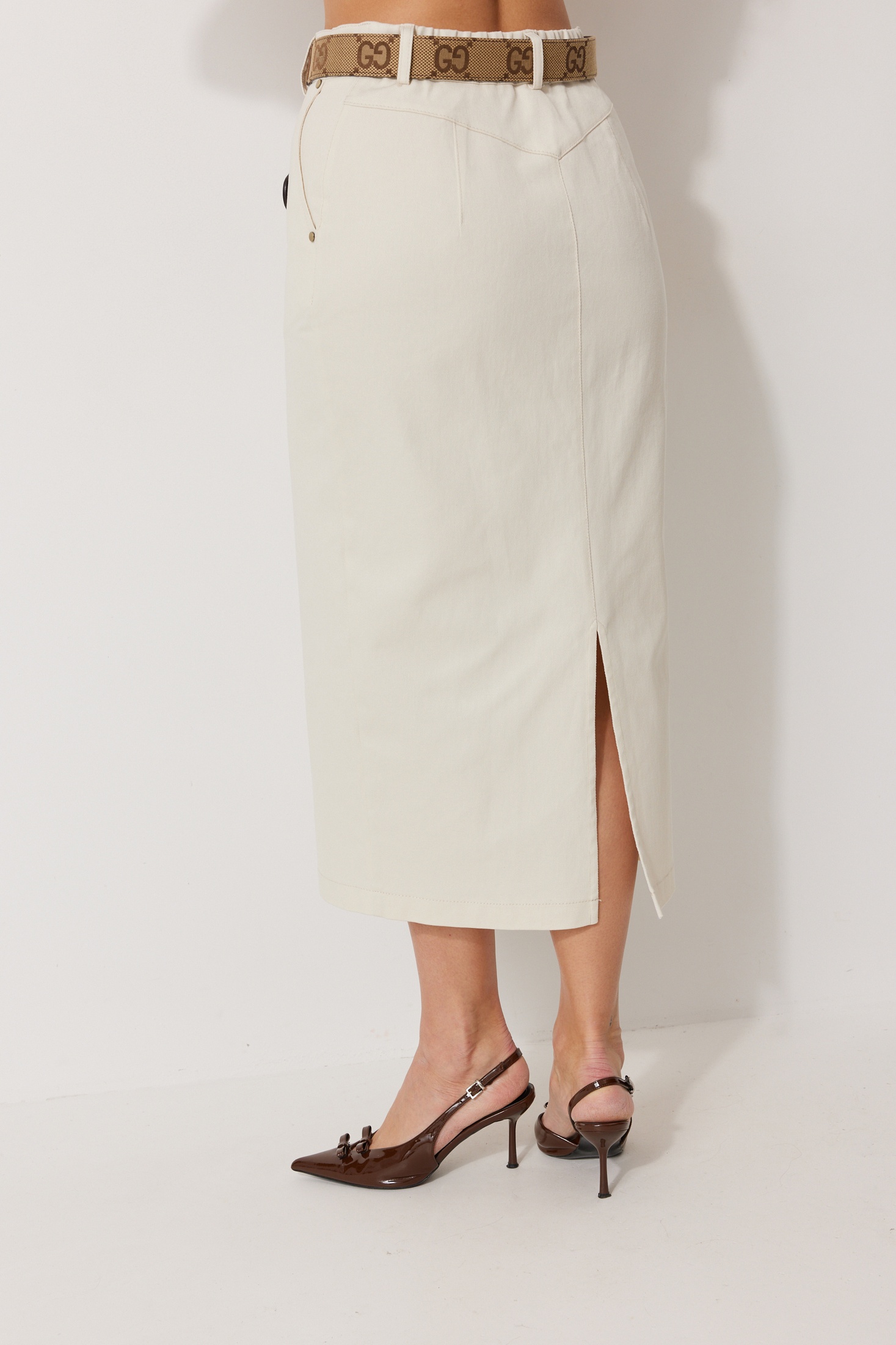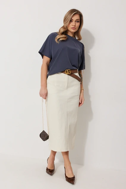 Юбка-карандаш женская из джинсовой ткани. Длина юбки до середины икры. По переду в юбке обработаны карманы с отрезным бочком, по концам кармана установлены хольнитены. Перёд юбки с центральным швом, в котором обработан гульфик с застежкой – молнией. Спинка юбки со средним швом в котором располагается разрез. Верх спинки юбки с отрезной фигурной кокеткой и вытачками. Верхний срез юбки обработан отрезным поясом, с резинкой по спинке и шлевками. Пояс застегивается на кнопку. Длина брюк по боковому шву 90см.
