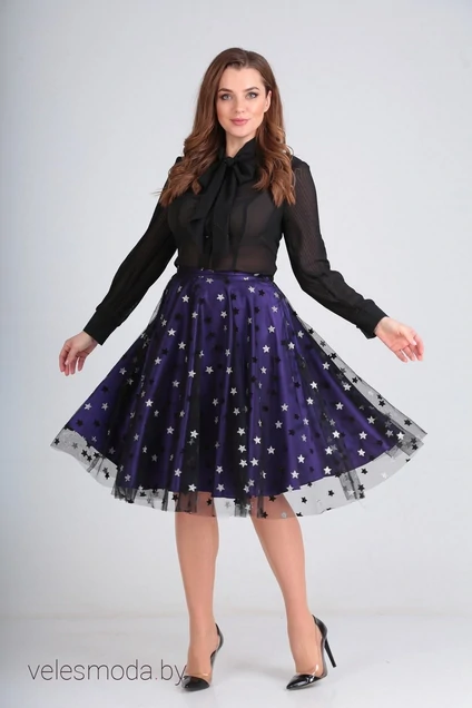 Юбка нарядная солнце-клёш. Состоит из двух видов ткани. Верхний слой сетка со звёздами серебро и чёрные флок. Нижний слой из фиолетового сатина с блеском. По линии талии пришит пояс. Застёжка в левом боковом шве на потайную тесьму-молнию и петлю и пуговицу. Силуэт лёгкий и струящийсяДлина верхней юбки 65см. Длина нижней юбки-60см