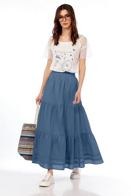 Юбка женская, прямая, широкая. Длина макси. По переднему и заднему полотнищу два подреза со сборкой. Верх юбки обработан прямым поясом. По низу юбки отделочные складки. Юбка на подкладке.