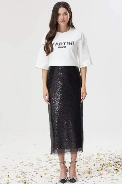 Стильная юбка прямого кроя выполнена из ткани с пайетками. Изделие на резинке. В среднем шве заднего полотнища юбки длинный разрез. Длина юбки: 89 см