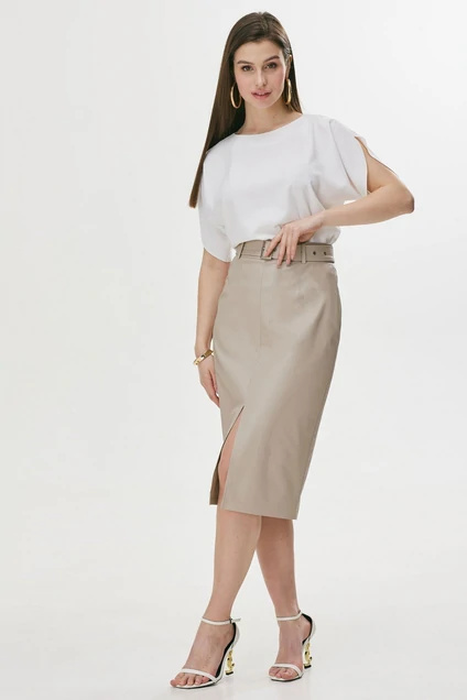 Классическая юбка-карандаш прилегающего силуэта из экокожи . По верху юбки притачной пояс со шлевками для ремня. По переду и спинке вытачки. В среднем шве переднего полотнища разрез. В комплект входит съемный пояс. Обращаем ваше внимание, что фурнитура может незначительно отличаться от фото. Длина изделия: 67 см +4.5 см пояс