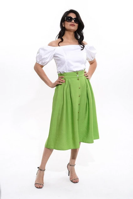 Юбка свободного кроя, трапециевидного силуэта, со складками, длина миди, без подкладки. Впереди на пуговицах с планкой вдоль всего изделия. Втачной пояс на пуговице, по бокам на резинке. В боковых швах карманы. Длина изделия - 79 см.
