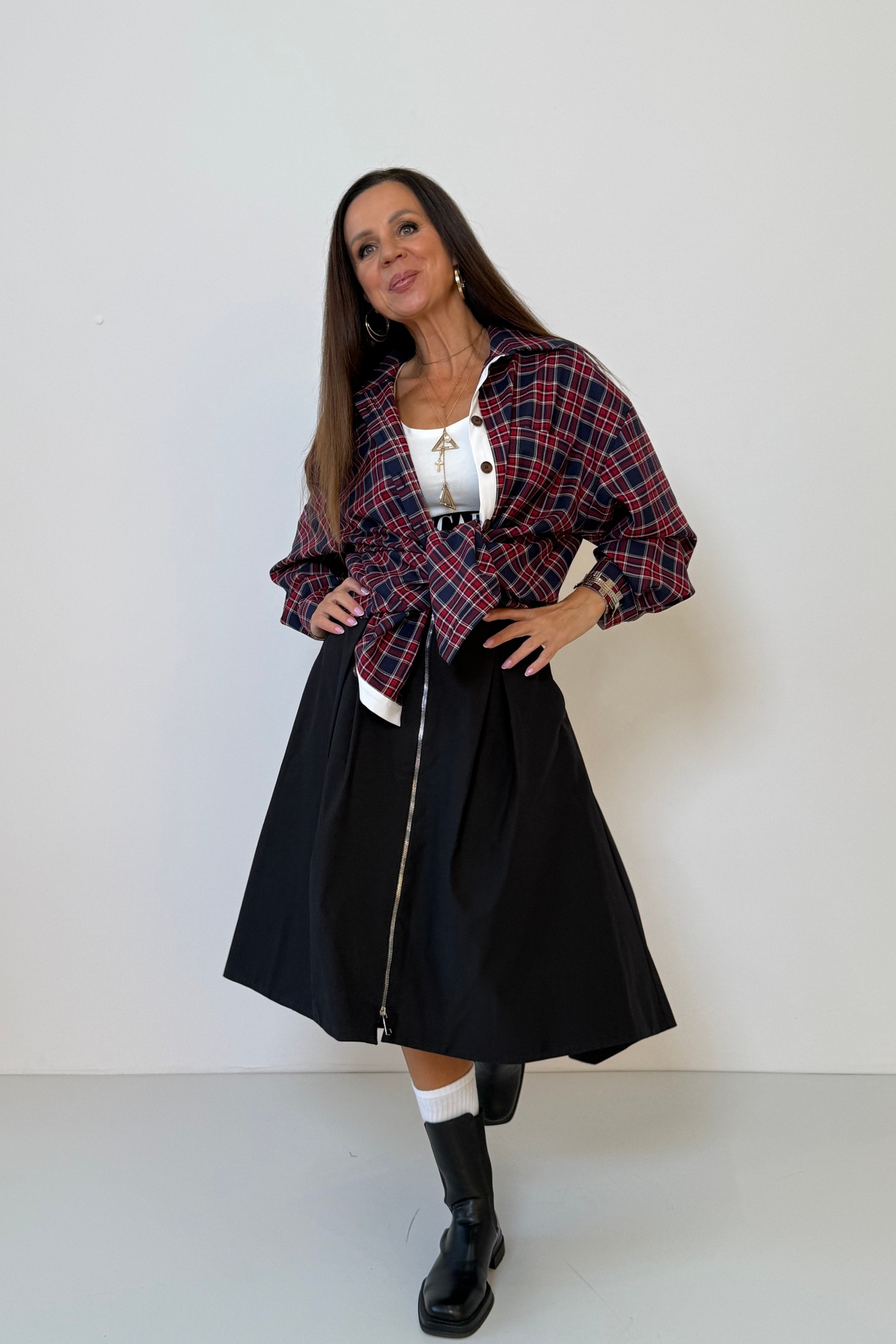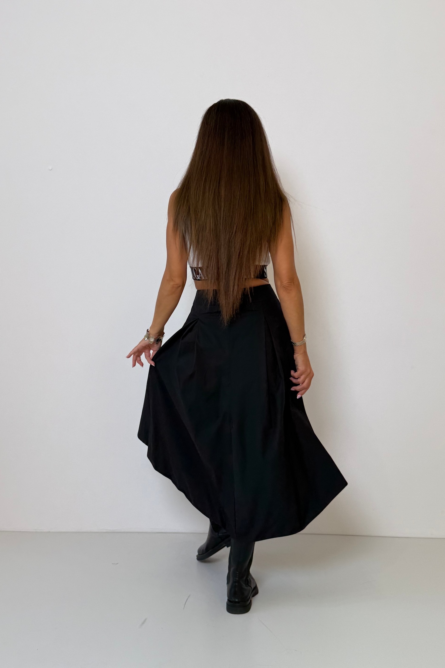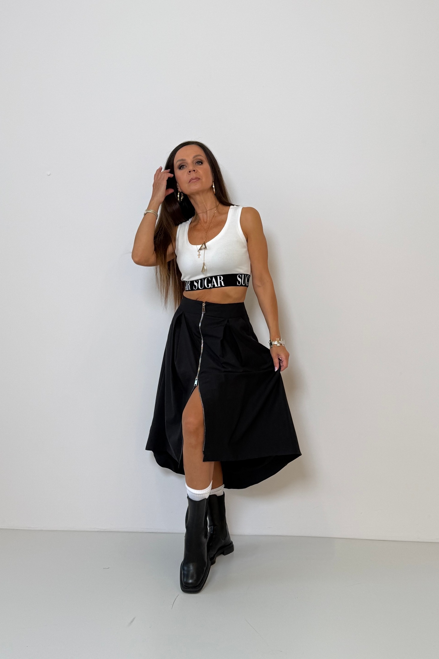 Юбка на подкладке, расширенная к низу спереди на молнии.По верхнему срезу переднего и заднего полотнища заложены сладки. Верхний срез обработан обтачкой. В боковых швах обработаны карманы.