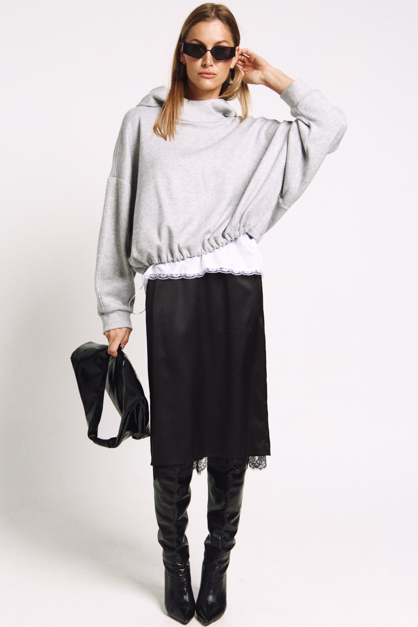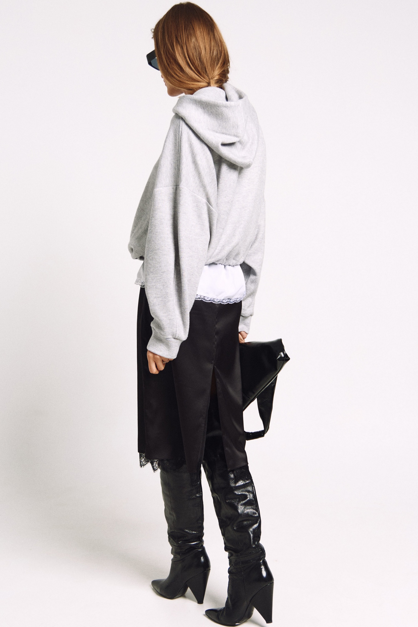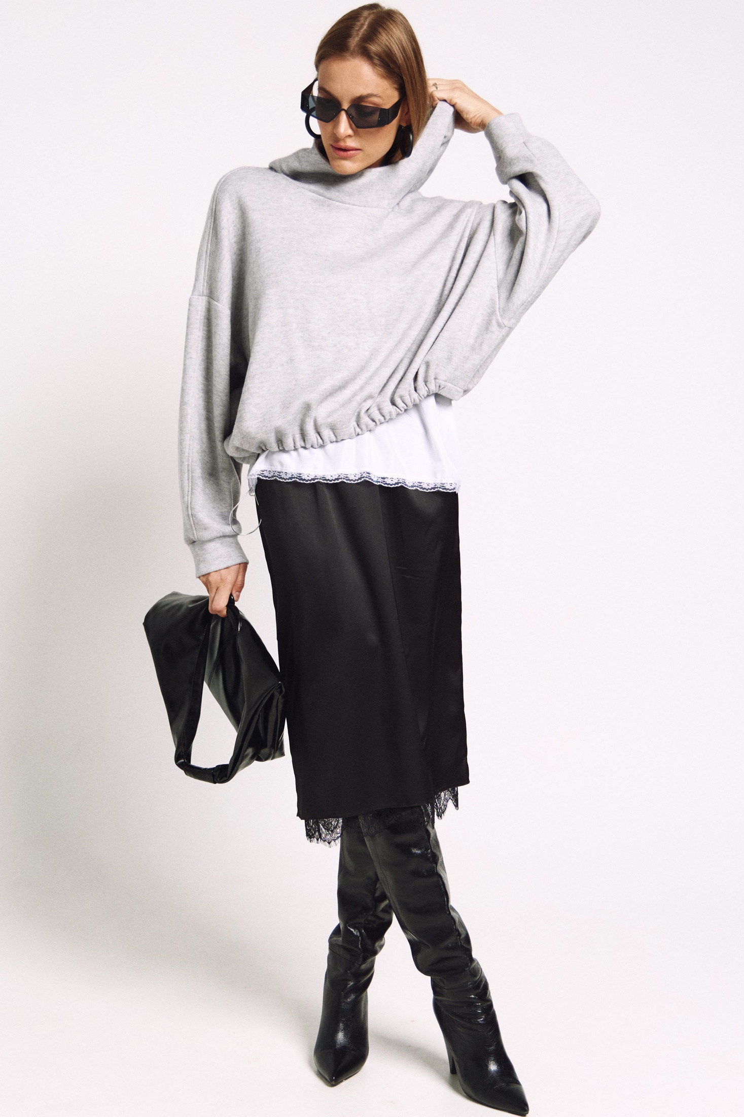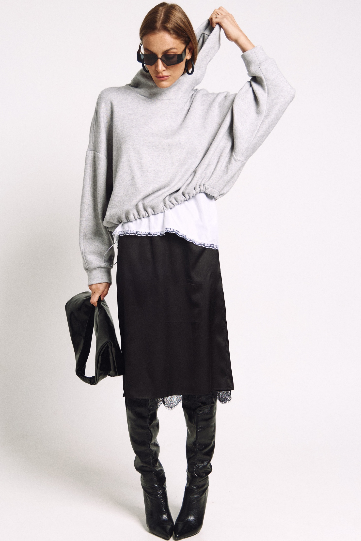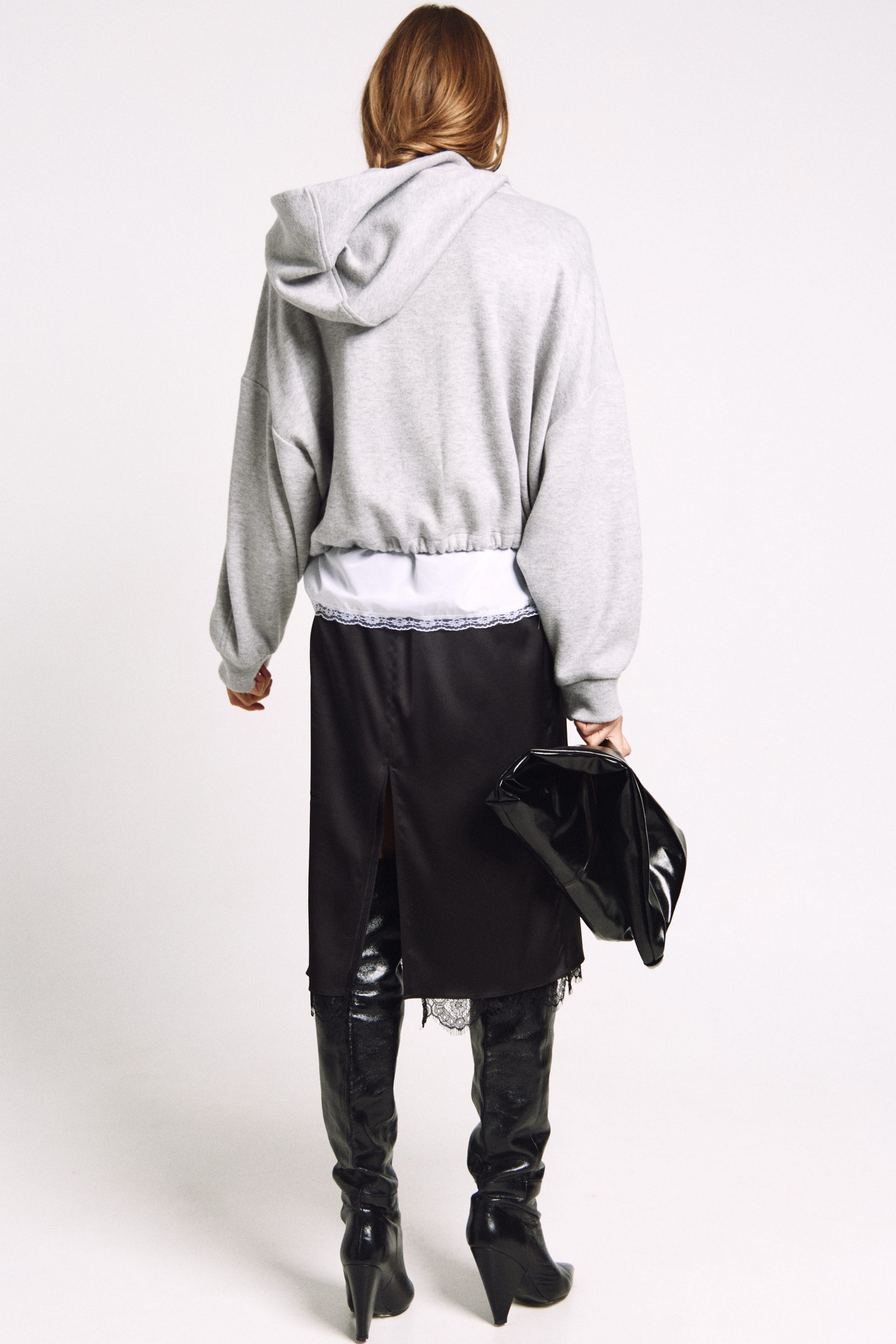 Юбка прямого силуэта на подкладке, к низу пожкладки притачано французское кружево черного цвета. Сзади юбки - высокий разрез.