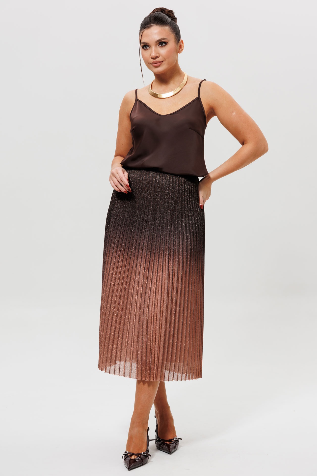 Эта модная юбка гофре с градиентом (Арт. 1276) станет ярким акцентом в вашем гардеробе. Модель выполнена в технике гофре и окрашена в изысканный градиент — от глубокого шоколадного верха к нежному светло-коричневому низу. Широкая резинка на поясе обеспечивает идеальную посадку по фигуре и максимальный комфорт. Юбка в складку отлично сочетается с базовыми топами (арт.1164), водолазками(арт 810) и укороченными жакетами, позволяя создавать стильные повседневные и вечерние образы. Размеры 46-52