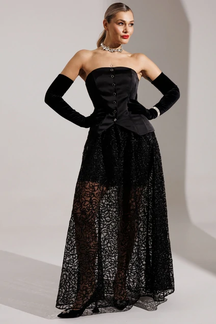 Хотите образ, который соберет все восторженные взгляды? Не ищите дальше! Встречайте главную героиню новогодней ночи! Юбка, которая состоит из двух слоев: нижняя часть зауженная мини, а верхняя — длинная, пышная. Верхний слой выполнен из черной сетки, расшитой декоративной тесьмой. Притачной пояс и молния сзади завершают образ. Вы выглядите безупречно и чувствуете себя уверенно в любом движении! Завершите образ с помощью корсета из нашей новогодней коллекции. В дуэте они раскрываются на все 100%: баланс пышности низа и собранного верха. Ваш готовый билет на самый стильный Новый год!