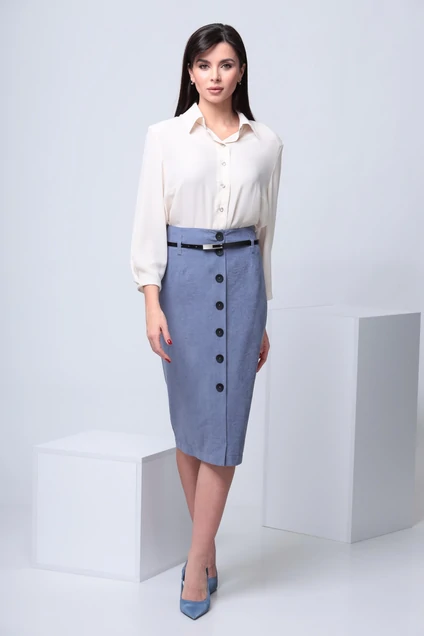 Юбка прямого силуэта с завышенной талией по переду застежка на пуговицы. Талия подчеркнута съемным поясом. Длина изделия: 72см