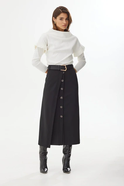 Стильная юбка женственной формы с запахом, длиной миди. По переду застежка на петли и пуговицы. В боковых швах карманы. Ремень в комплекте.