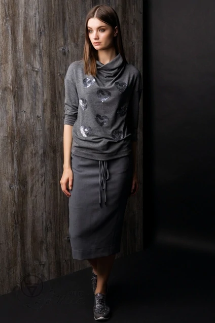 Юбка из костюмной поливискозной ткани с поясом на резинке и кулисе, с рельефами, переходящими в боковые карманы.