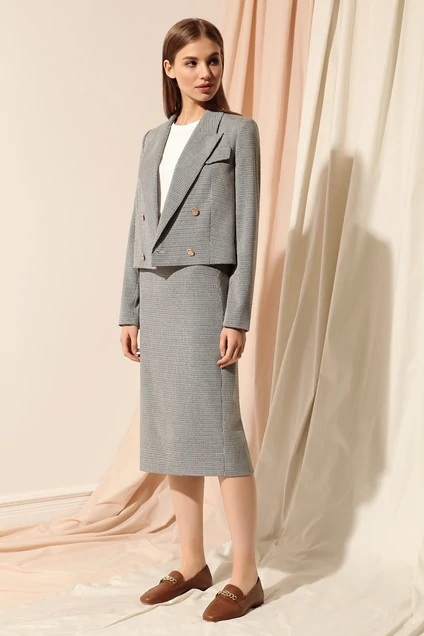 Стильная юбка из костюмной ткани с содержанием вискозы с дизайном «гусиная лапка». Юбка на притачном поясе, сзади со средним швом и застежкой на потайную молнию и разрезом в складке по низу. Изделие на подкладке.