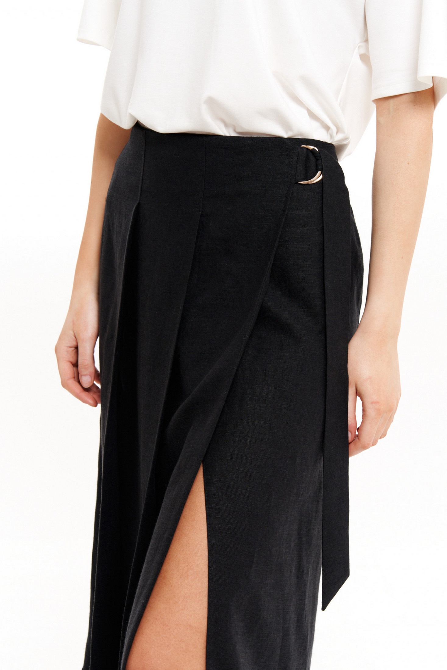 Элегантная женская юбка классического прямого кроя, выполненная из ткани с высоким содержанием льна и вискозы, идеально подходит для повседневной носки. Благодаря своим качественным материалам, юбка обеспечивает комфорт в летние и весенние дни, сочетая стиль и практичность. Юбка свободного кроя расширяется к низу, что придает ей утончённый вид, а обработка верхнего среза обтачкой и боковая регулировка пояса добавляют удобства и надежности. Особенностью модели является стильный запах с двумя складками, который добавляет изысканности и делает юбку идеальной для деловых встреч и офисных будней.