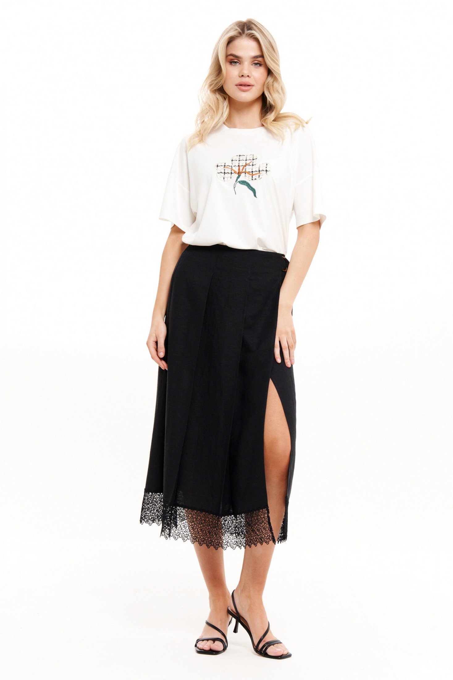 Заднее полотнище юбки украшено двумя талиевыми вытачками, которые подчеркивают форму и создают элегантный силуэт. Нижний срез юбки обработан кружевом, что придает ей нарядный и утончённый вид, идеально подходящий для вечерних выходов.