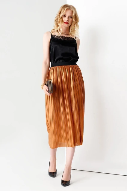 Юбка плиссе - модная одежда, которую вы сможете носить в теплое время года. Она эффектно выглядит в сочетании с блузкой или топом. Юбка в складку, созданная из струящейся ткани с изысканным блестящим напылением, сделает ваш образ элегантным и женственным. Трикотажная юбка прямого кроя, с множеством мелких складок, отлично садится по фигуре любого типа, скрывая лишние сантиметры на бедрах. Эластичная декоративная резинка контрастного тона, располагающаяся по поясу, подчеркивает тонкую талию, придает силуэту стройность. Юбка миди, прикрывающая колени, не стесняет движений, визуально увеличивает рост. Женская юбка скроена с укороченной подкладкой из эластичного трикотажа, которая помогает изделию держать форму. Материал с нежной поверхностью не накапливает статическое электричество, не раздражает кожу.