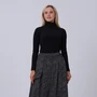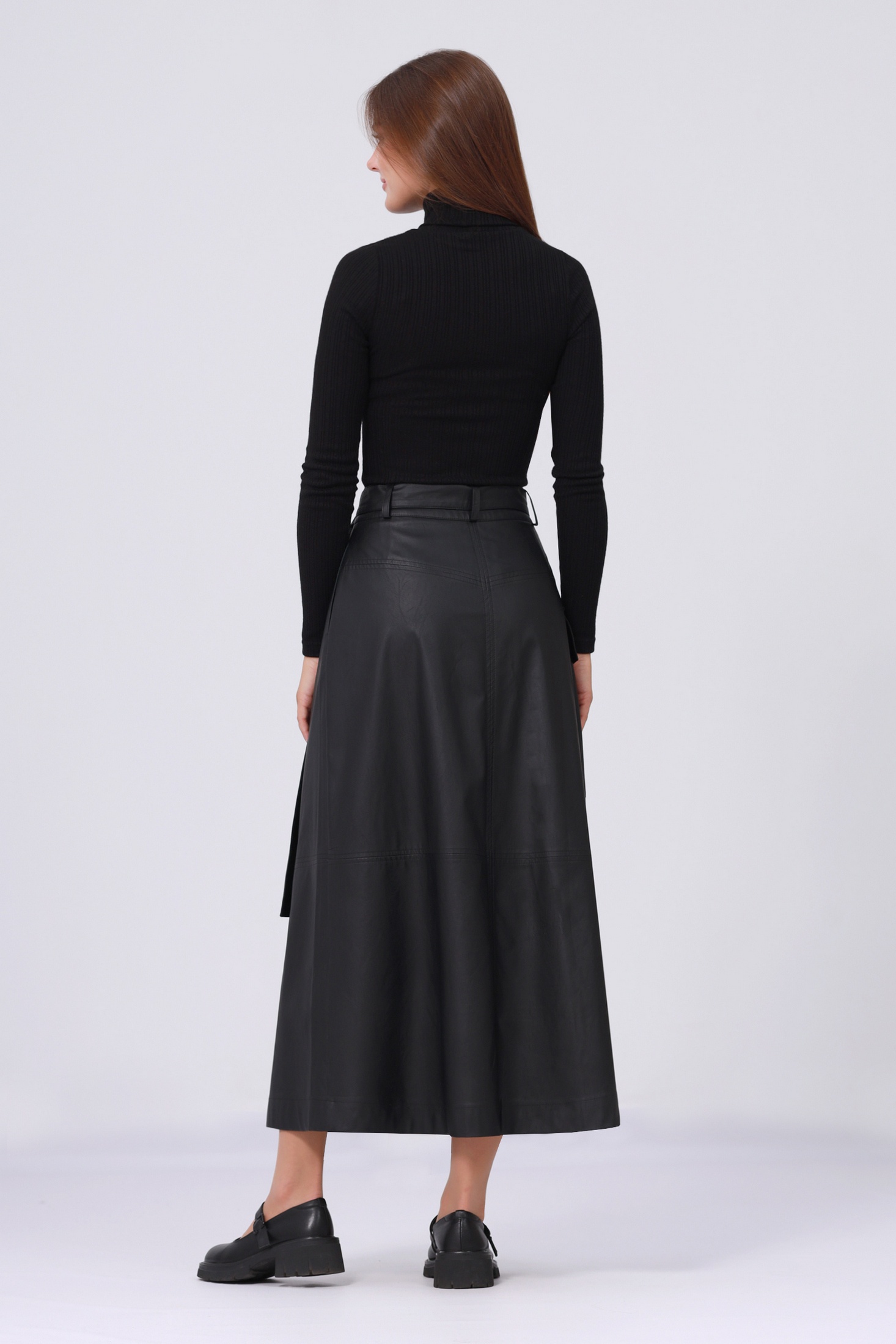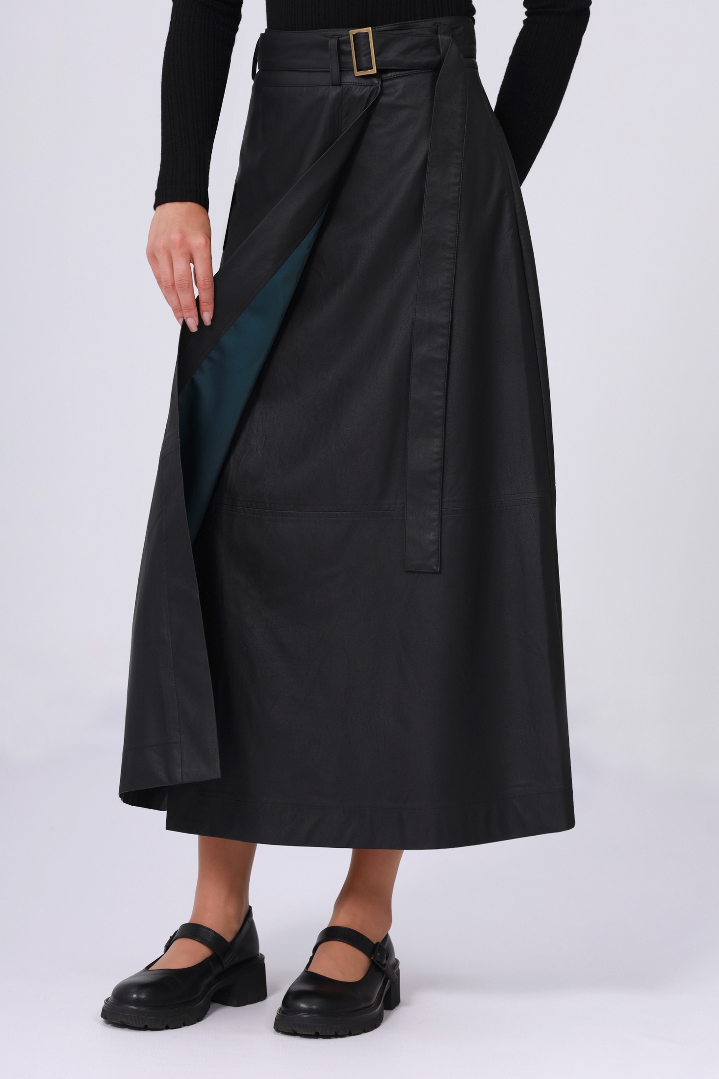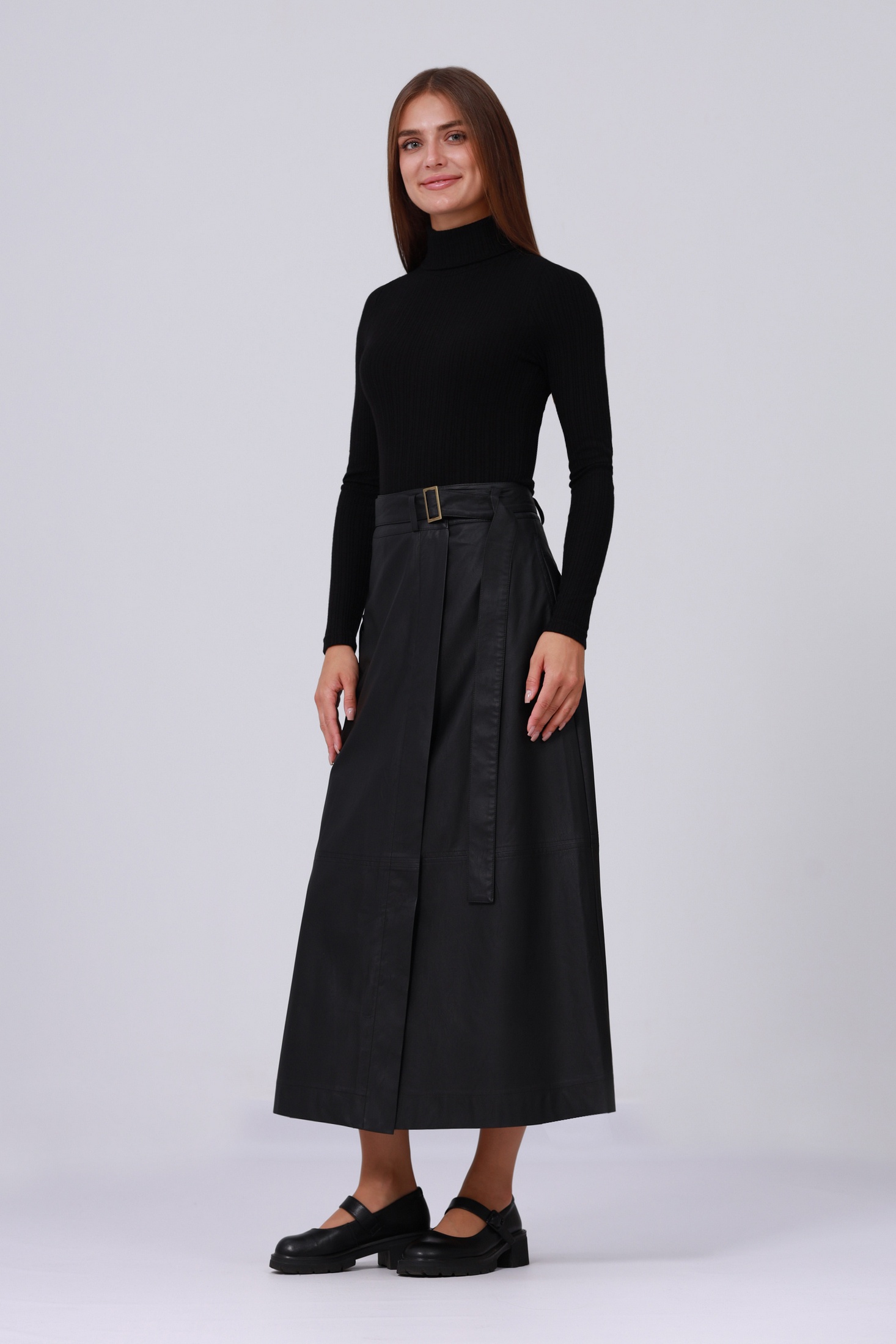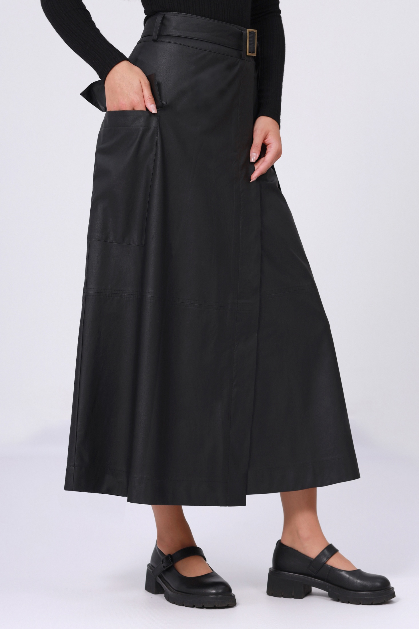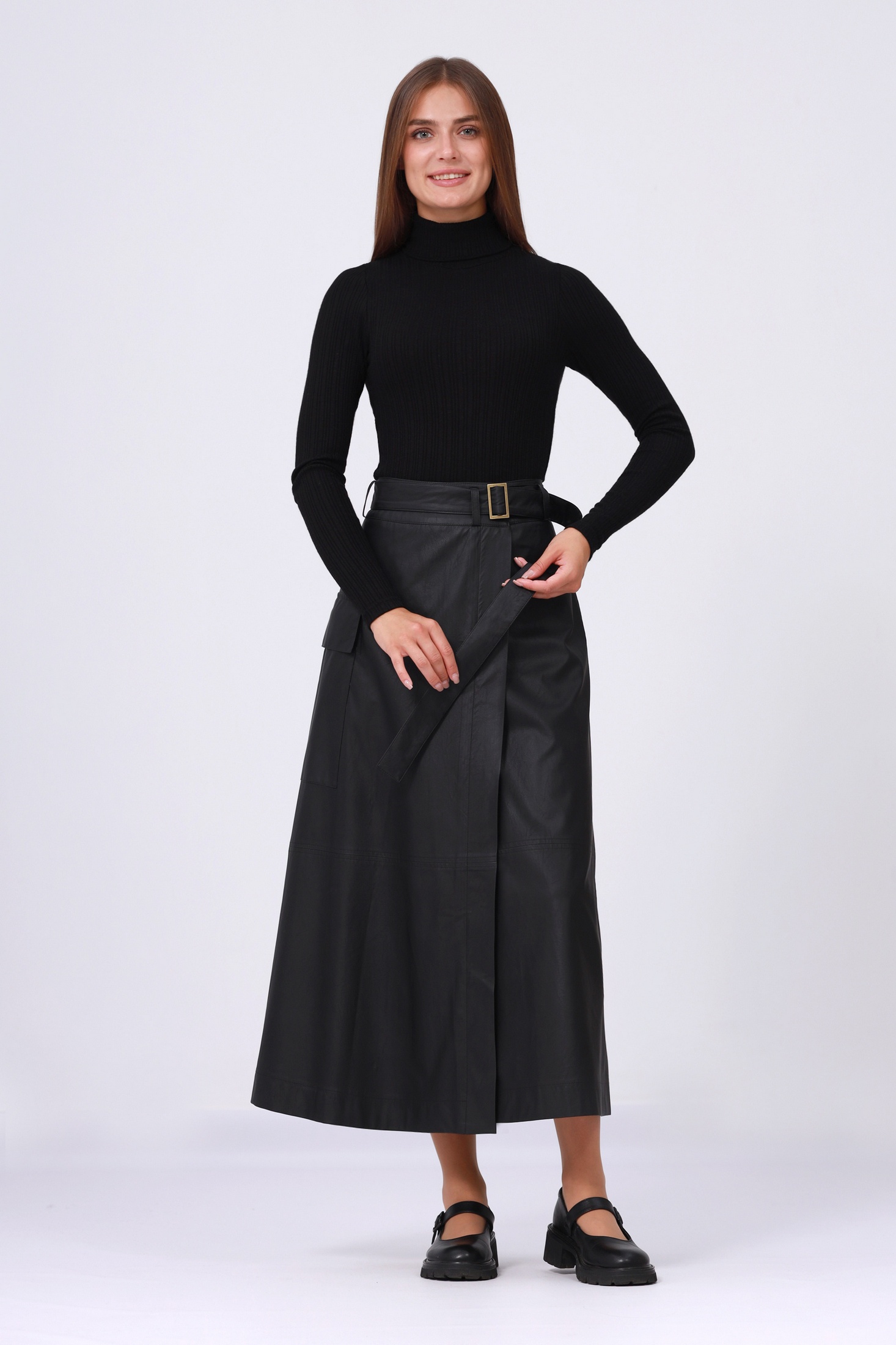 Юбка женская на подкладке А-силуэта. Большая глубина запаха. Пояс съёмный с пряжкой. Левый карман в боковом шве, правый - накладной с клапаном. По спинке изделие со средним швом, кокеткой и декоративным модельным сечением. Длина по боковому шву - 91,50 см.
