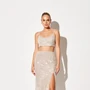 Юбка прилегающего силуэта, с притачным поясом, рельеф переднего полотнища заканчивается разрезом, потайная застежка-«молния» в среднем шве заднего полотнища.