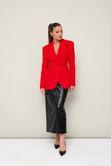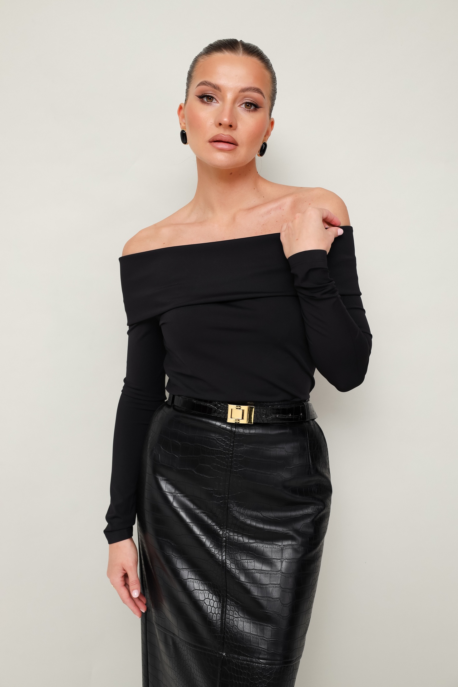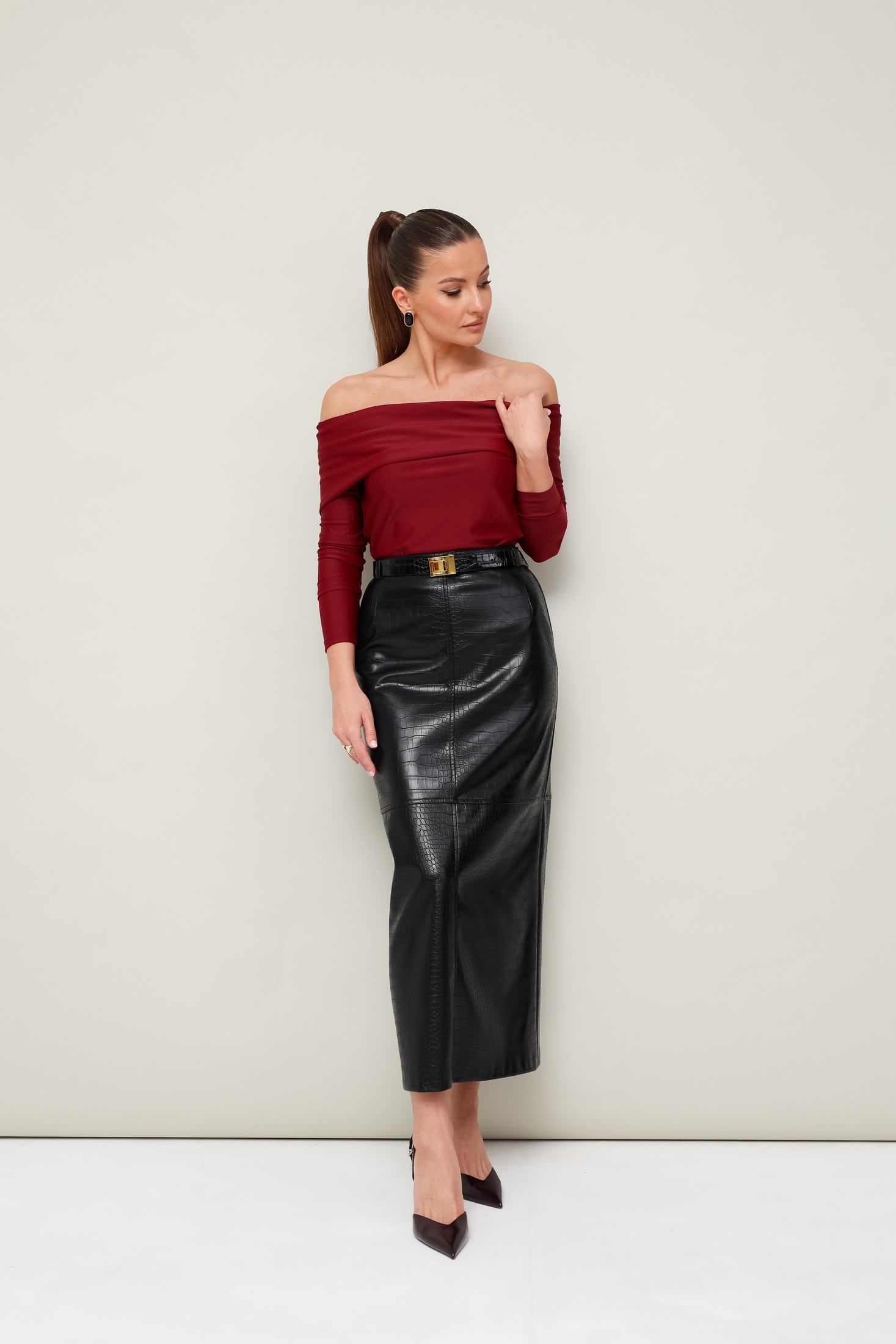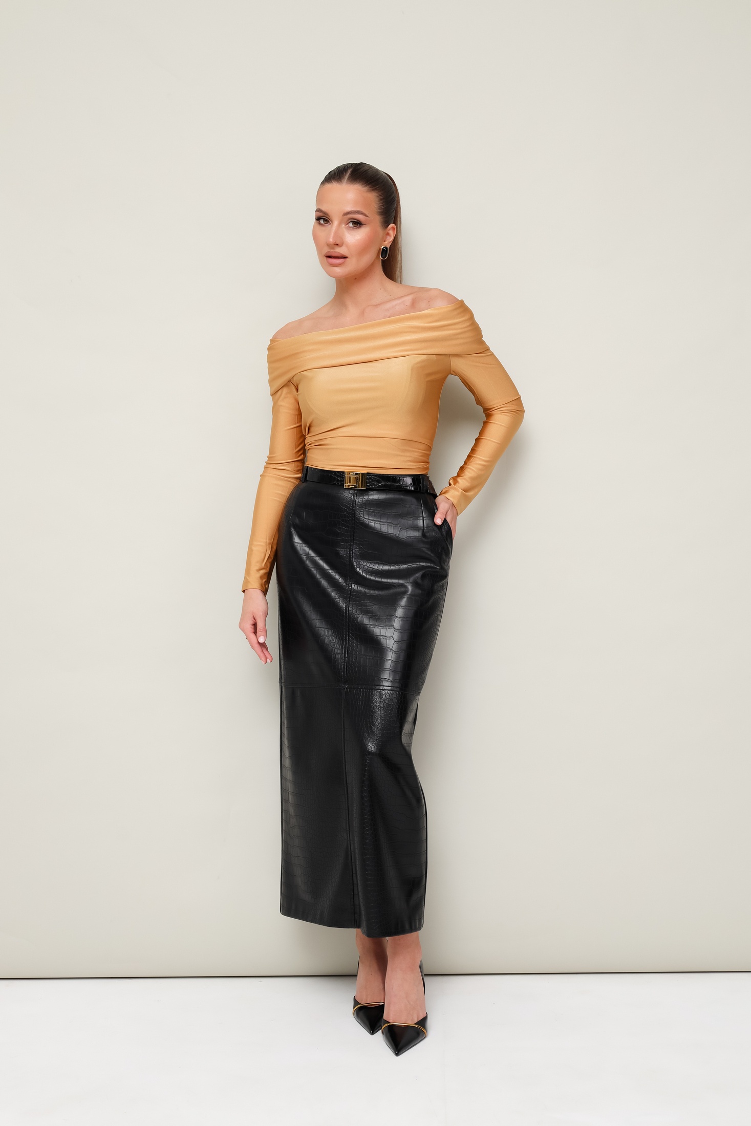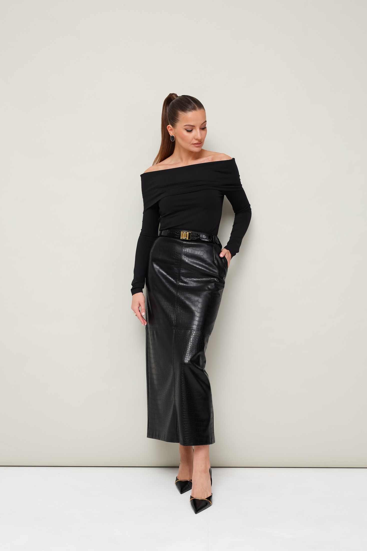 Юбка из искусственной кожи черного цвета. Элегантная модель миди-длины придаст вашему образу современный и стильный вид. Особенности дизайна включают притачной пояс с потайной молнией в среднем шве и боковые наклонные карманы. Юбка на подкладке и обработана сзади шлицей для удобства движения. Эта модель идеально подходит для офиса или для создания элегантного вечернего образа. *Ремень представлен как вариант стилизации образа и не входит в комплект.