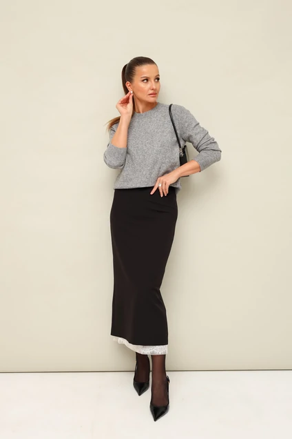 Юбка-карандаш прямого силуэта в длине миди. Верхняя юбка выполнена из костюмно-плательной ткани, пояс на обтачке, застёжка на потайную молнию в среднем шве по спинке. Нижняя юбка на резинке по поясу, низ обработан кружевной отделкой с сеткой. Для удобства движения сзади по юбкам обработаны разрезы.
