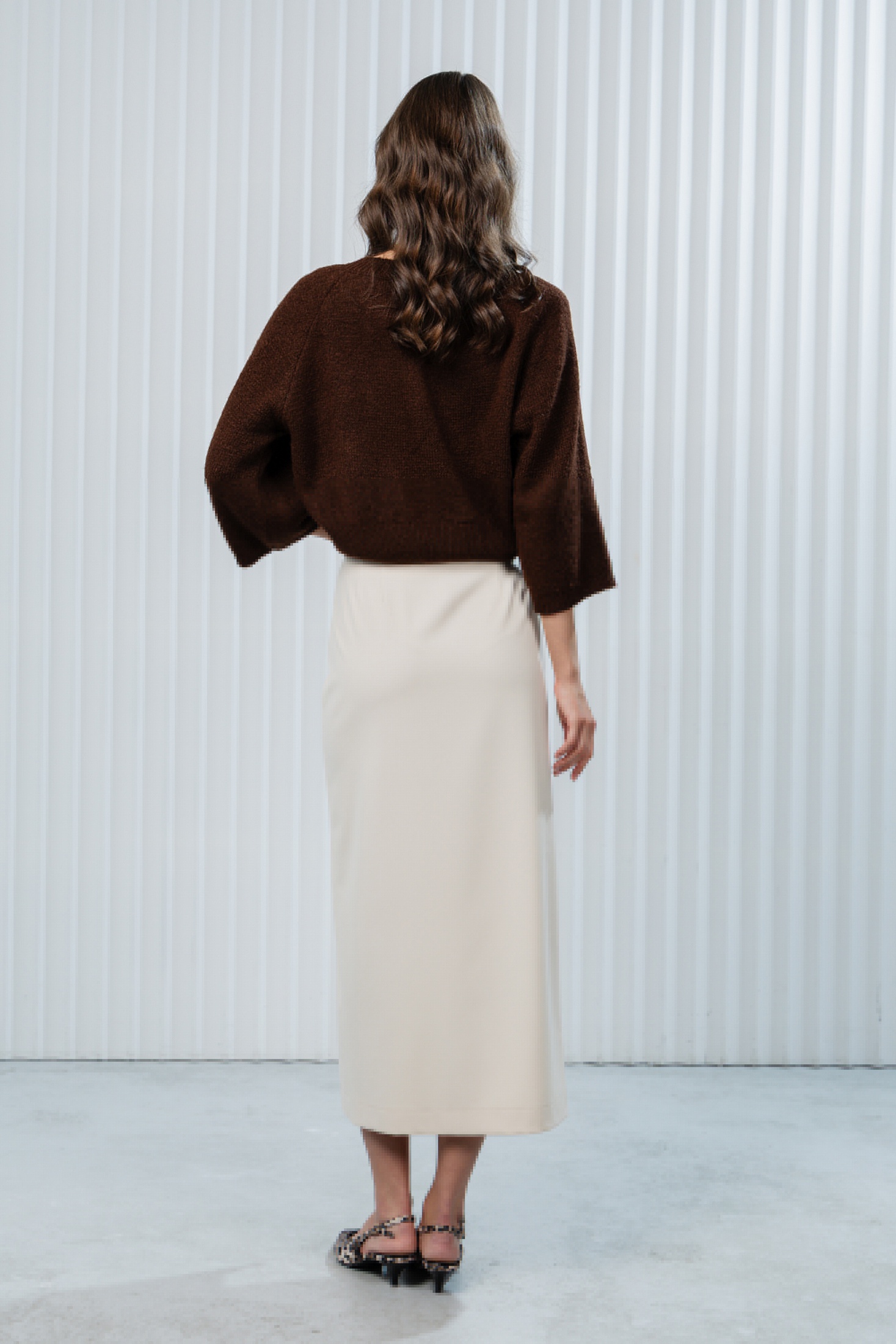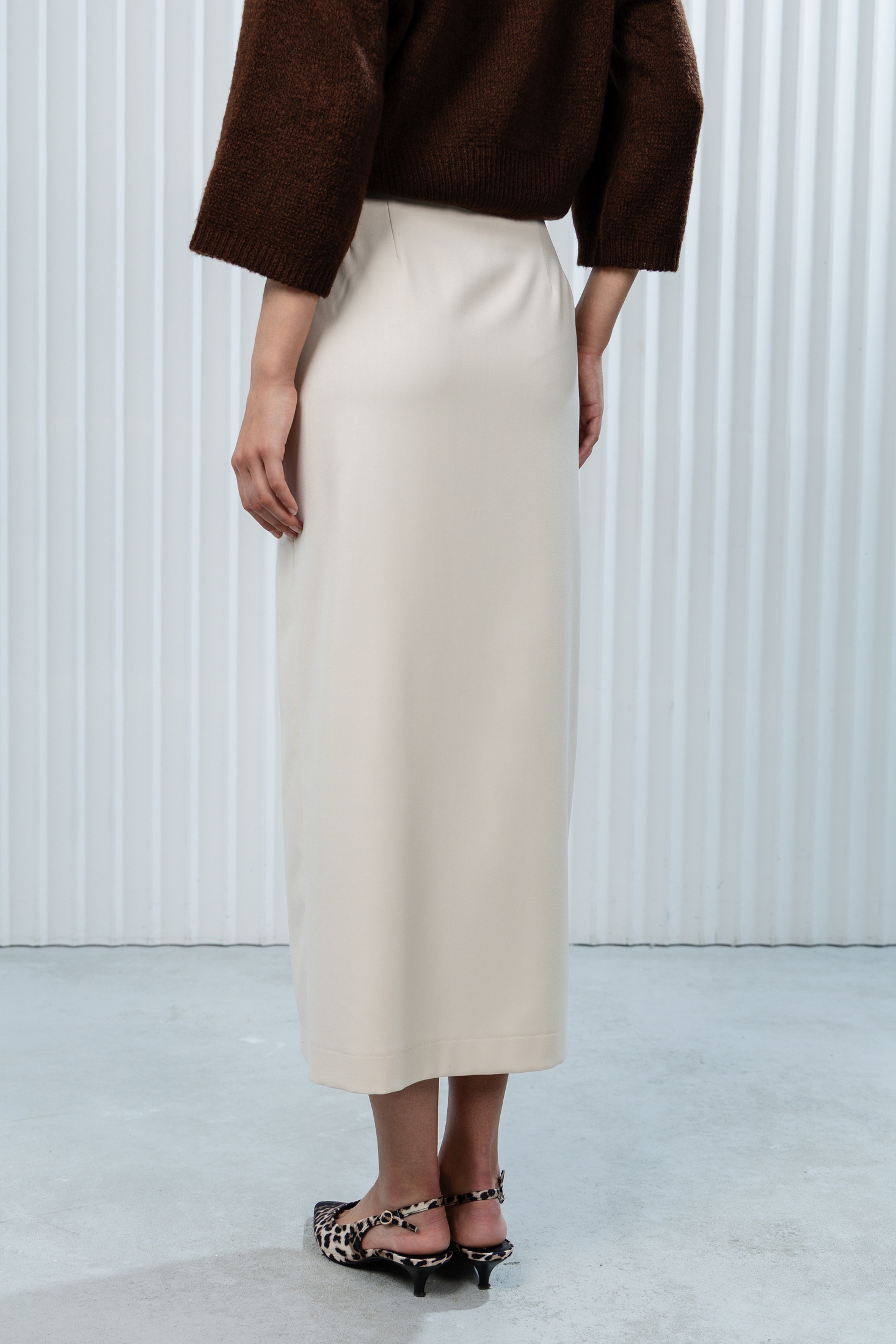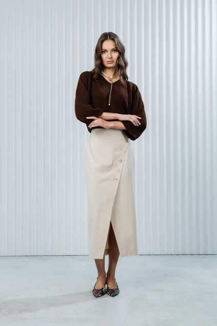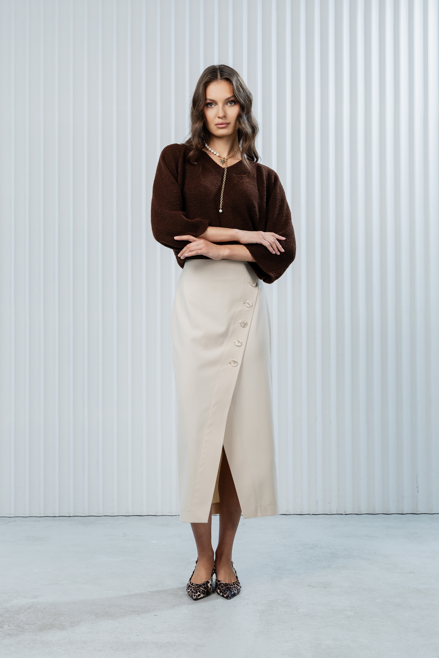 Дизайн: юбка-карандаш с асимметричным разрезом и декоративными пуговицами на боку. Классический крой и строгий силуэт подчеркивают женственность и элегантность;