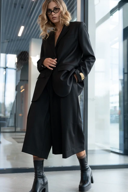 Юбка-брюки широкого, свободного силуэта. Передние части со швом и мягкой складкой. Горизонтальный шов чуть ниже линии колена создает стильный и модный силуэт изделию. Застежка-гульфик, по переду боковые наклонные карманы. Пояс стабильный по переду, по задней части брюк на резинке, с настроченными шлевками и застежкой на пуговичку. Длина брюк по боковому шву с поясом 81 см. Размер 44: Ширина брюк по низу +-46 см. Параметры брюк в готовом виде в 44 р.: обхват талии 67 см (задняя часть пояса на резинке), обхват бедер +-102 см. Изделие сочетает в себе внешний вид юбки и функциональность брюк за счет широких штанин, создающих иллюзию юбки. Универсальный вариант, который подходит для повседневной носки, офиса и особых случаев, обеспечивая комфорт и свободу движений.