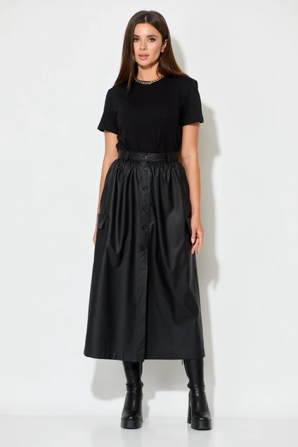 Юбка 4304 SILVERSPICE – идеальный выбор для современного гардероба. Коллекция бренда SILVERSPICE предлагает изысканную юбку миди из матовой эко-кожи, соединяющую стиль и комфорт. Пояс со сборкой и настроченными шлевками обеспечивает удобную посадку, а застежка на пуговицах добавляет классические нотки. Накладные карманы с клапаном на боковых швах – практичное решение для повседневной носки. Миди длина 90 см делает эту юбку идеальной для осенне-зимнего сезона, отличаясь универсальностью – от офиса до прогулок и празднований. Черный цвет подчеркивает элегантность и утонченность этой модели.